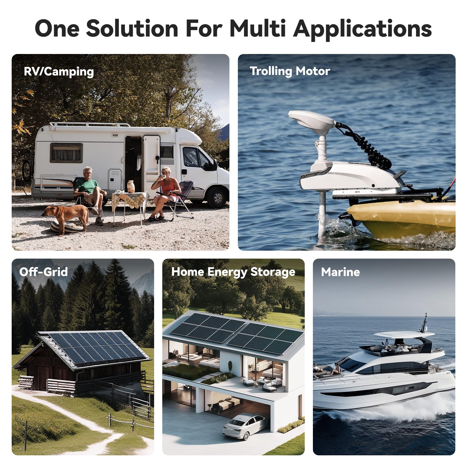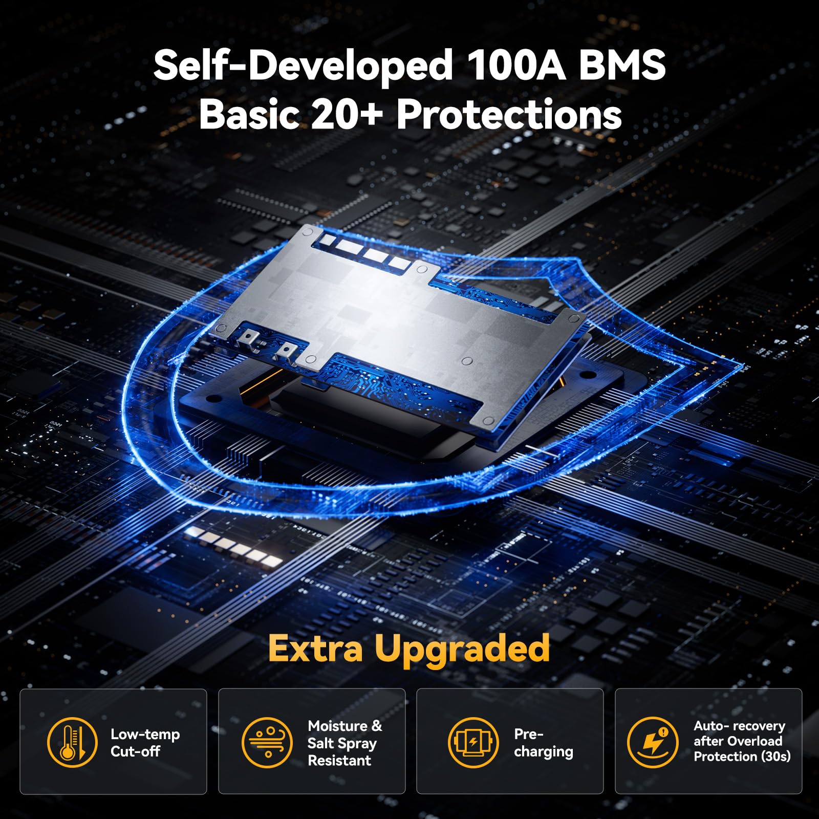 Self-Developed Smart BMS with 20+ Protections: guards overcharge,over-discharge,over-current,short circuit,over-temp and more - safer operation for RV, marine and solar systems