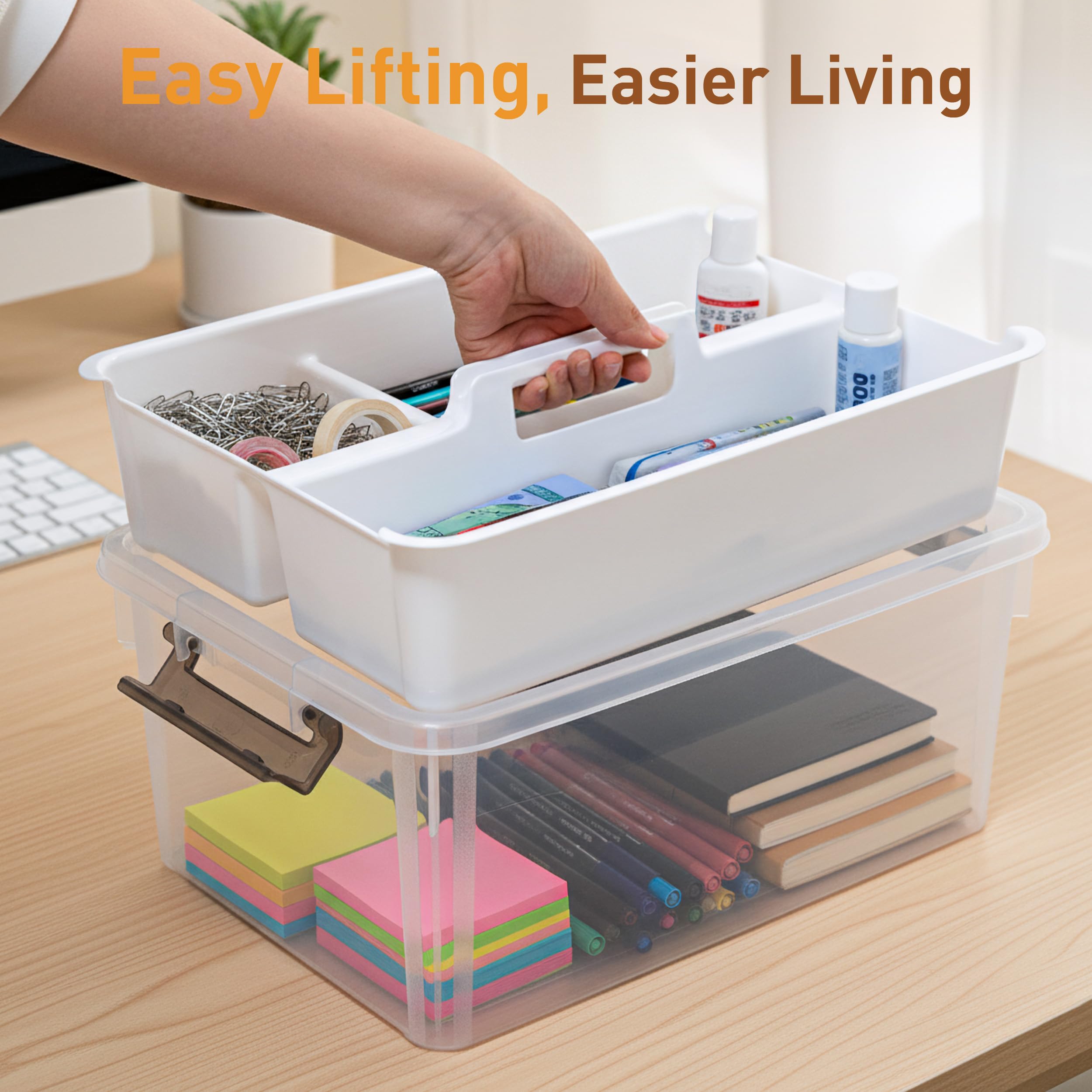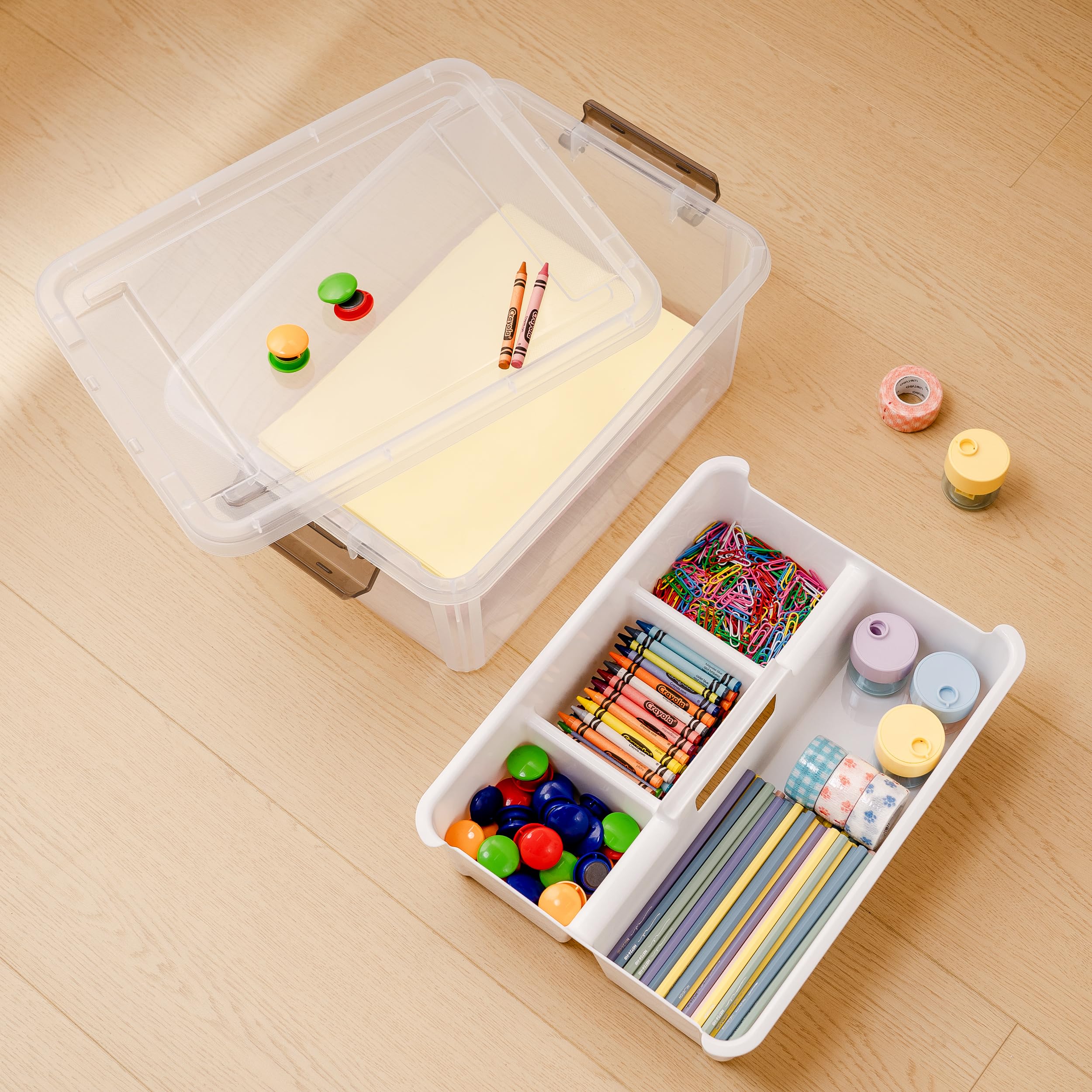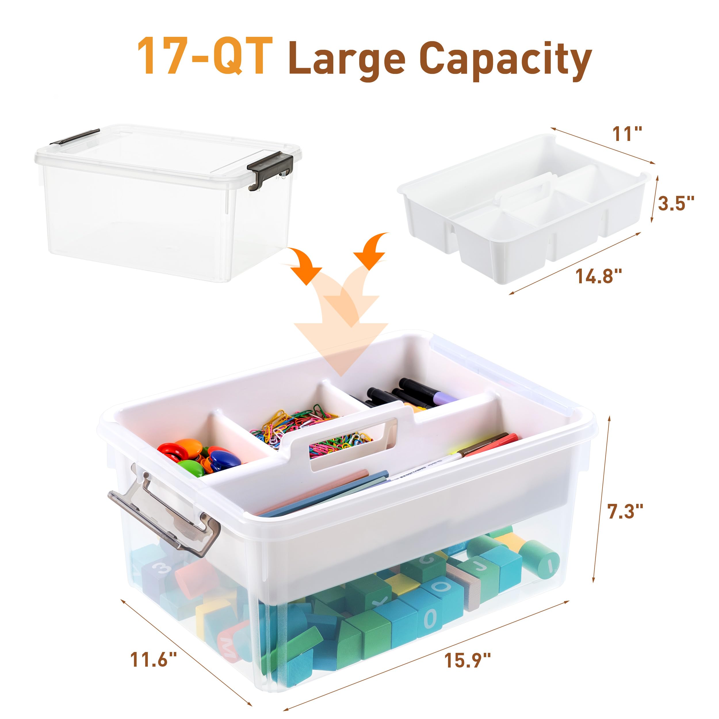 【17-Quart Capacity】Capacity: 17-quart. Overall Dimensions: 15.94"L * 11.61"W * 7.28"H. Perfect for arts and crafts supplies, stationery, lego, kids building blocks, sewing kit, and other small tools;