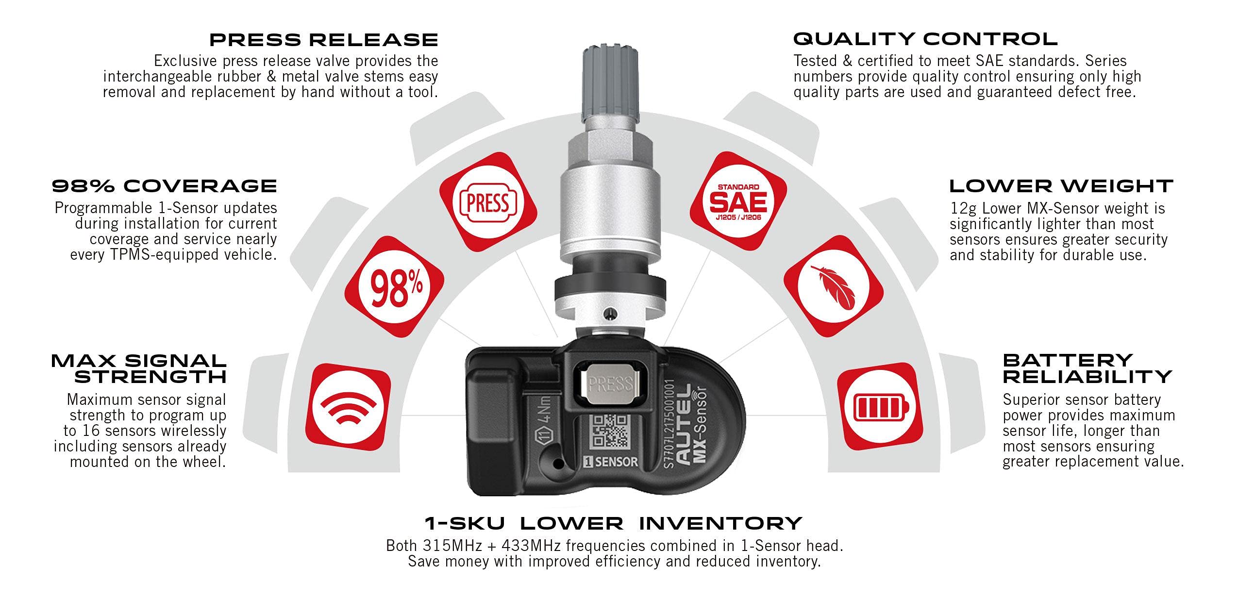 This package includes 8pcs sensors. Autel 1-Sensor combines both 315MHz + 433MHz frequencies into one TPMS sensor with the highest industry vehicle coverage. Built to match or exceed OEM sensors in frequency strength and durability, MX-Sensors are 100% ID clone-able with no relearn required and offer latest model vehicle coverage because they quickly update with an Autel wireless programming tool.