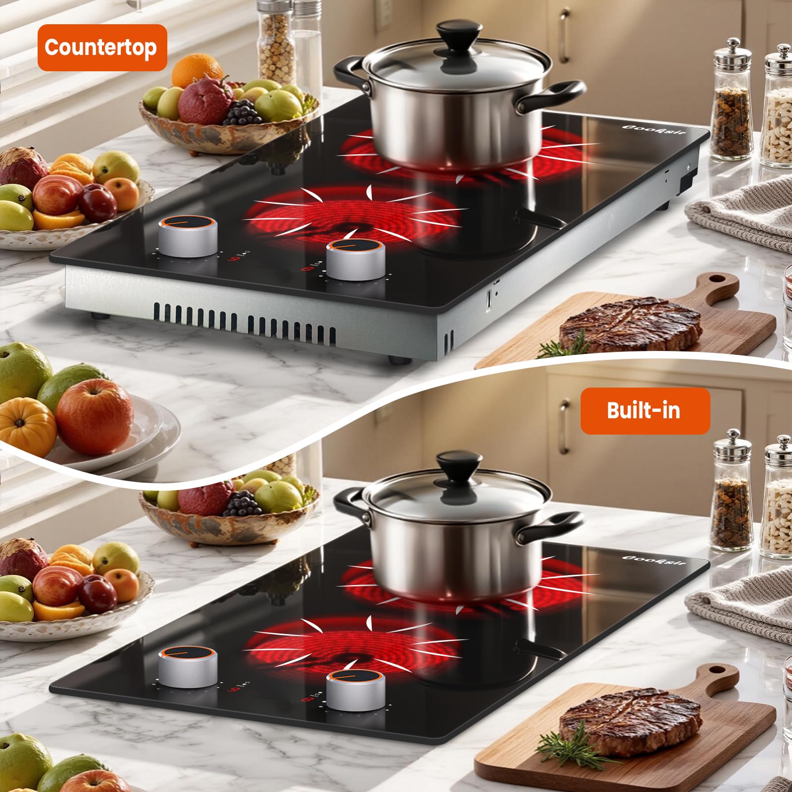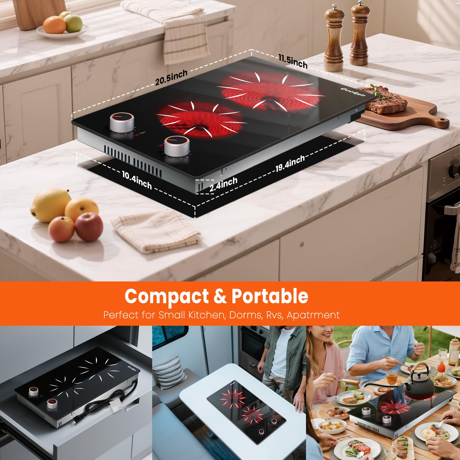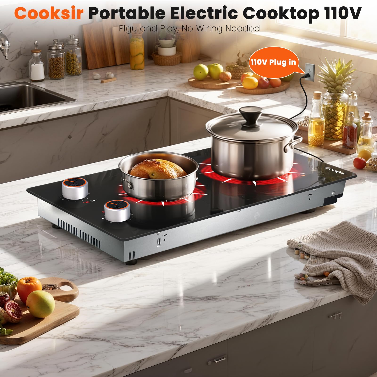 đă110-220V Plug in Ceramic HobăComing with a 120 voltage outlet plug, Cooksir double burner electric cooktop is portable and can be used anywhere like kitchen, apartment, rv or even camping. You do not need additional professional wiring, greatly saving your time cost and money costs.