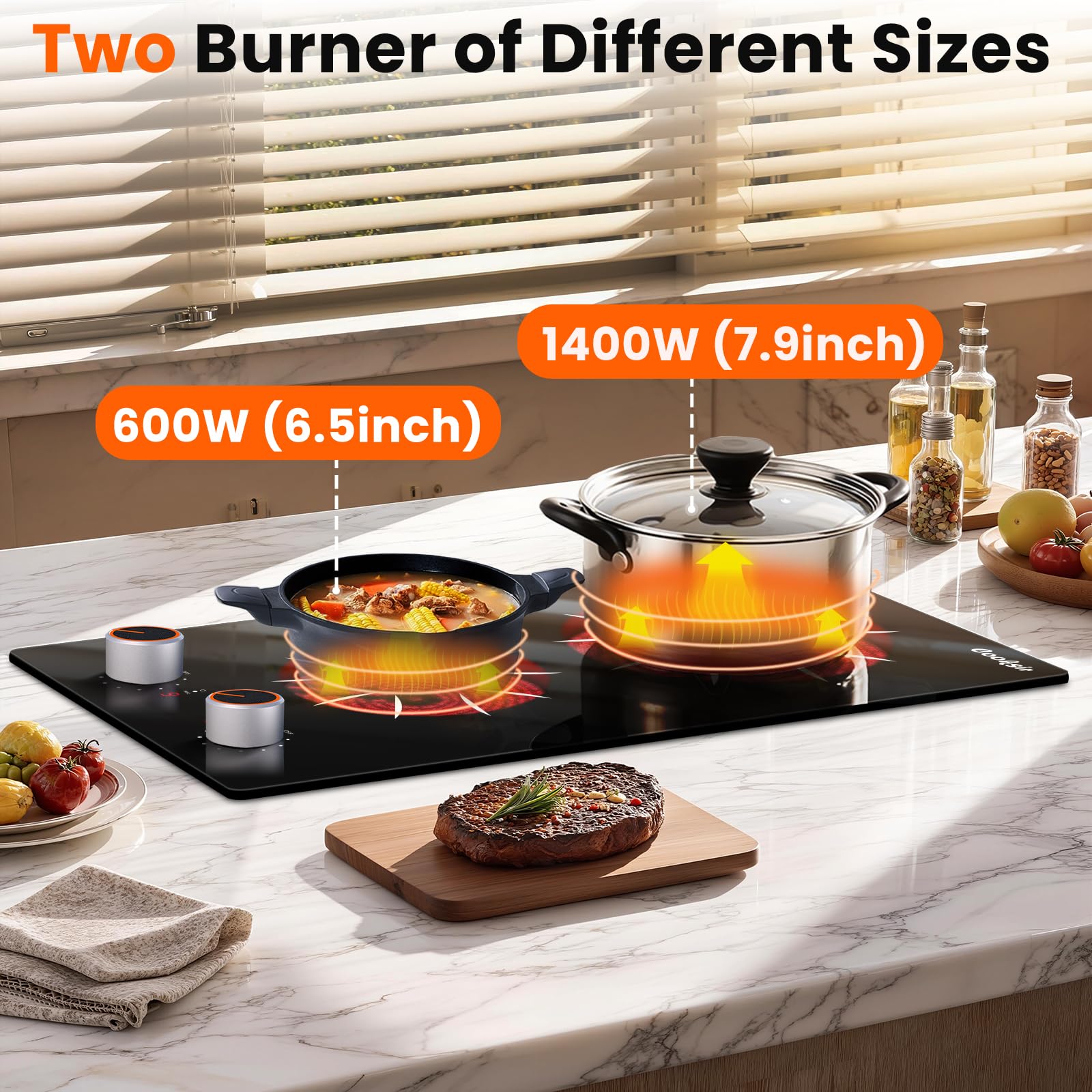 đăDual Powerful Cooking ZonesăCooksir 2 burner electric cooktop features two separate cooking zones, allowing you to cook multiple dishes simultaneously. Besides, our 12 inch electric stove has 9 power levels with total 2000W(1400W+600W). The bigger one can meet various cooking styles while the smaller one is ideal for keeping food warm.