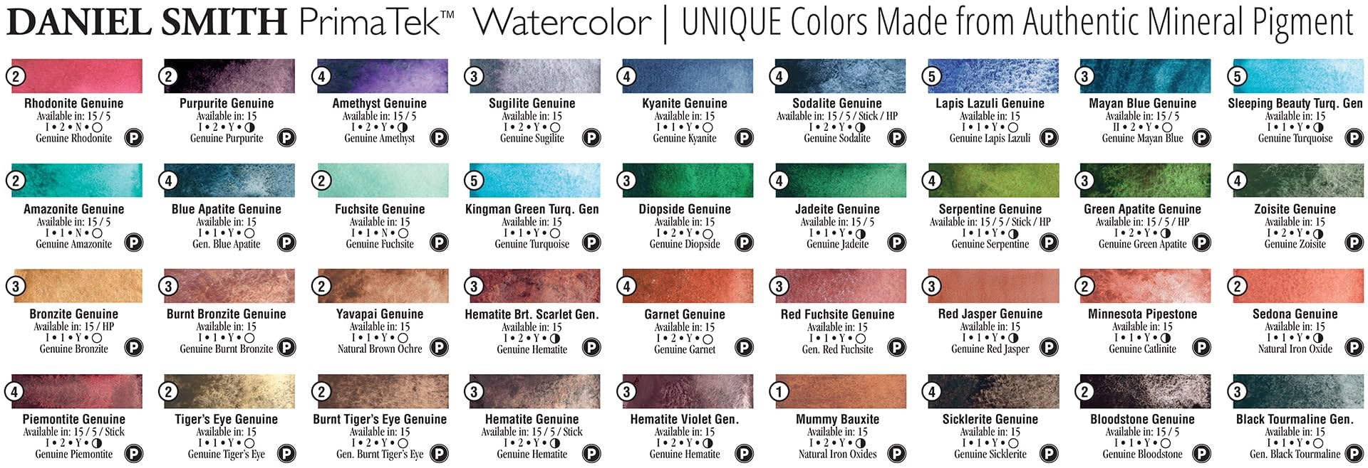 DANIEL SMITH is the Innovative Manufacturer of Beautiful Watercolors for Artists Worldwide, and makes the largest range of watercolors of any manufacturer, more than 240 colors. The 240+ color collection includes the exciting PrimaTek watercolors made from minerals (like Amethyst) plus other unique colors (like Moonglow) not available elsewhere, and Luminescent Watercolors which allow artists to capture the luminescent colors that exist in nature that regular watercolors cannot capture!