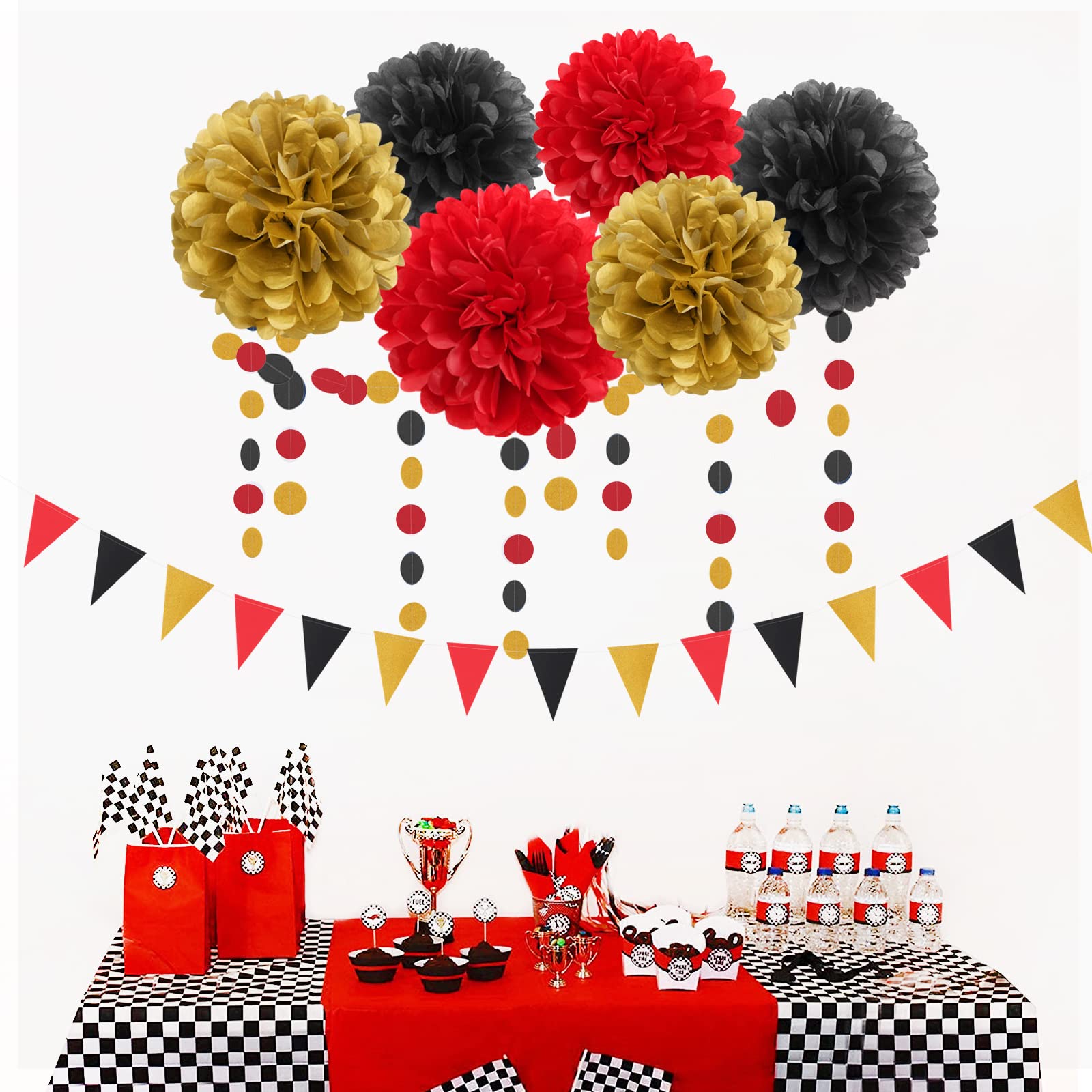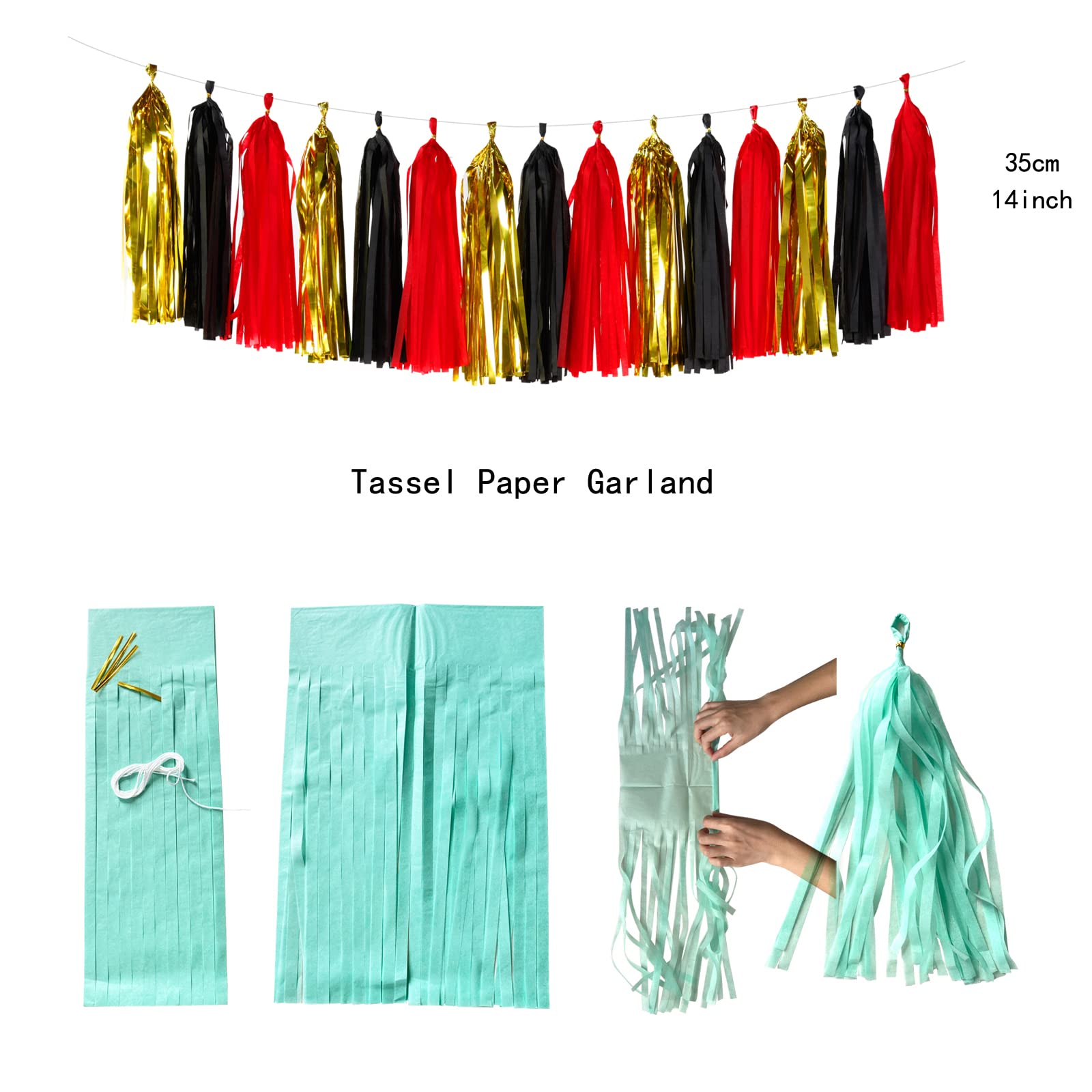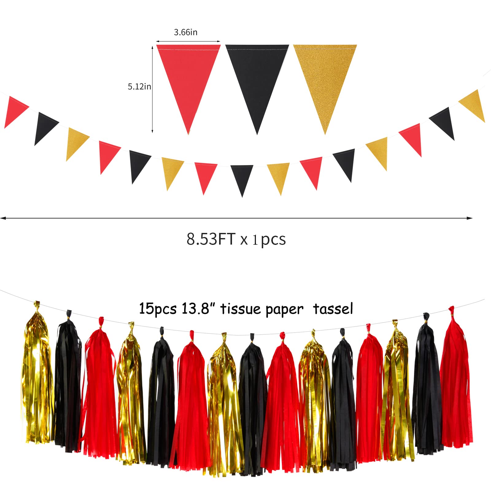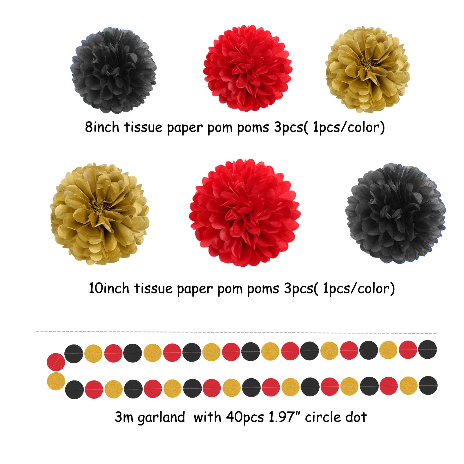 【Red Black Gold Party Kits】The party decorations kits include 6pcs tissue paper flowers: 3pcs 8" and 3pcs 10" in three color, 1pcs Triangle Flags,1pcs circle dots paper garland, 15pcs tassel garland. Total 23pcs. 【Widely Used】They are perfect for casino theme party decorations,game night party decorations ,birthday,wedding,baby bridal shower,bachelorette,engagement,red and black party decorations,red and gold party decorations and so on. 【DIY crafts】The tissue paper pom poms and tissue tassle paper garland come plain need to assembled. It will take about 1-2 hours, please diy them in advance. 【 Easy to assemble the banner and garlands 】The banner flags and circle dots garland can hang directly because they have been sewn together, which can really save your time and energy. 【Quality Guarantee】If you are not satisfied with the color, quality or other aspects,please contact us for a full refund or replacement. We have a 30 day refund guarantee for every order.