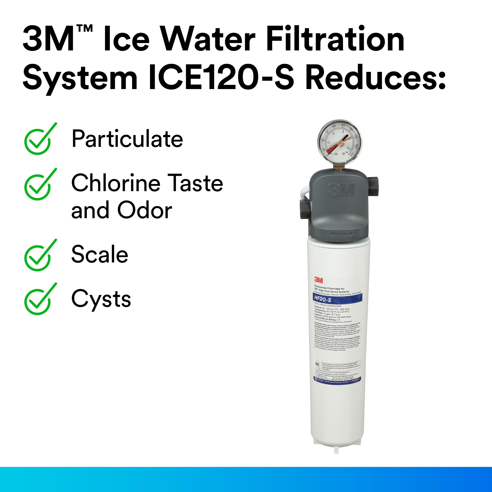 The 3M High Flow Series System for Ice Applications featuring Valve-in-Head Design, Model ICE120-S is designed for commercial ice machines and helps to reduce sediment, chlorine taste and odor, cyst and scale. The Sanitary Quick Change (SQC) design allows for no contact with the filter media during cartridge change-out. Also removes harmful microplastics
