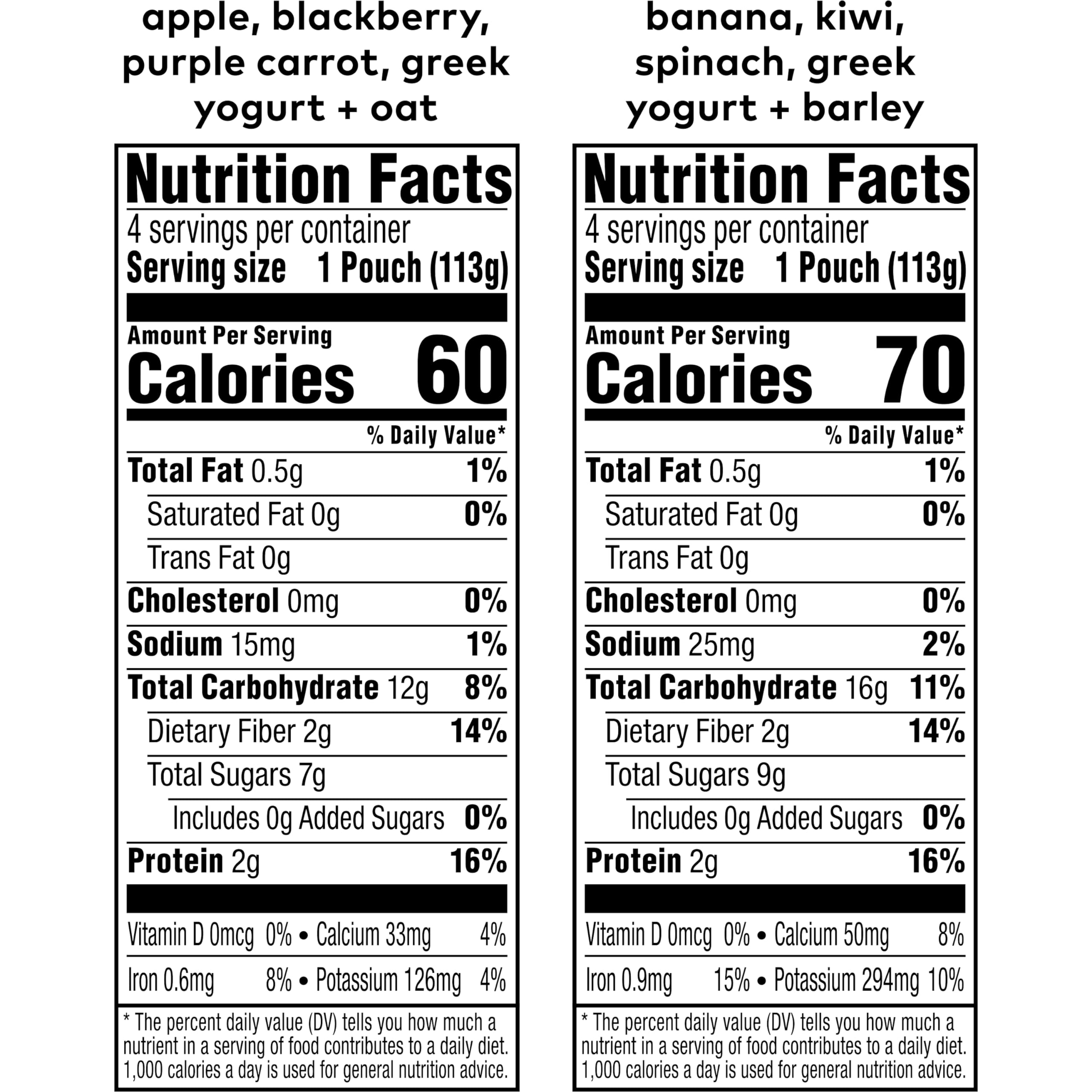 MADE WITH NATURAL FLAVORS: Apple, Blackberry, Purple Carrot, Greek Yogurt, and Oat and Banana, Kiwi, Spinach, Greek Yogurt, and Barley blends made with organic purees