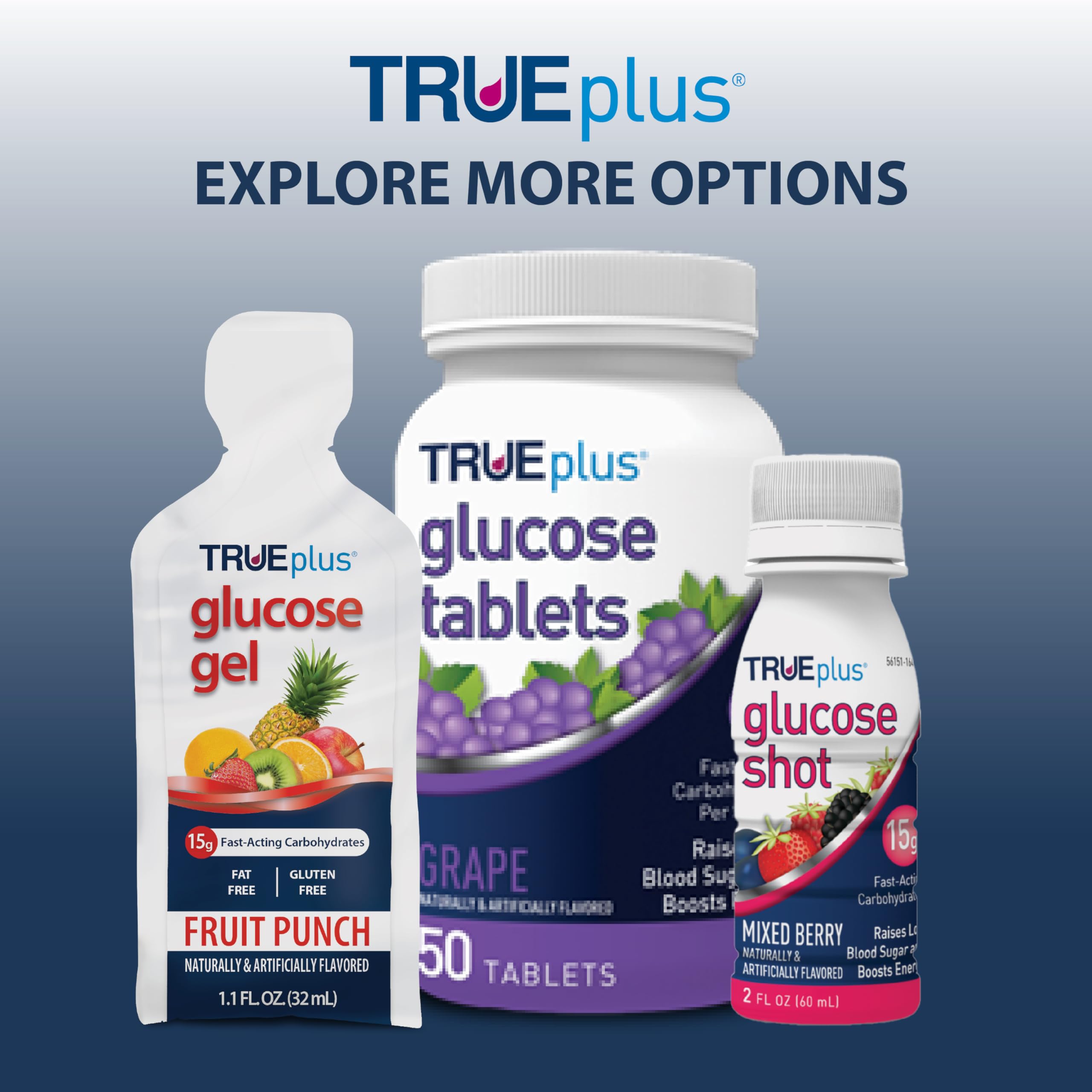 Part of a Full Line of Glucose Products: TRUEplus offers glucose gel packs, glucose tablets and glucose shots, trusted products for helping to manage low blood sugar and energy