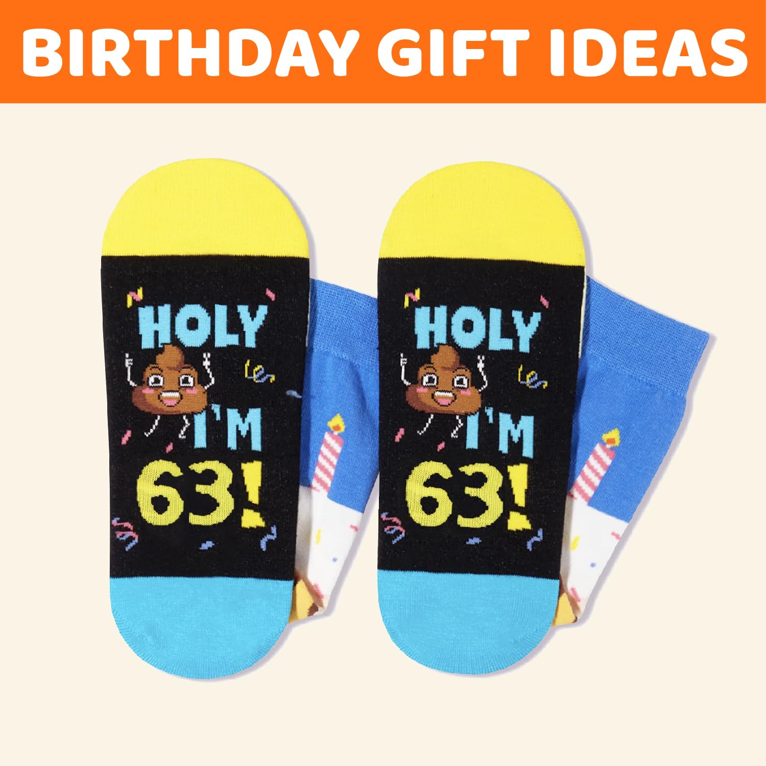 63rd BIRTHDAY GIFT IDEAS: These socks feature a cake and candle design on top, while the bottom is sewn with a fun message: "HOLY, I'M 63!". They are suitable for any holiday gifts, such as Birthday gifts, Christmas gifts, or White Elephant gifts.