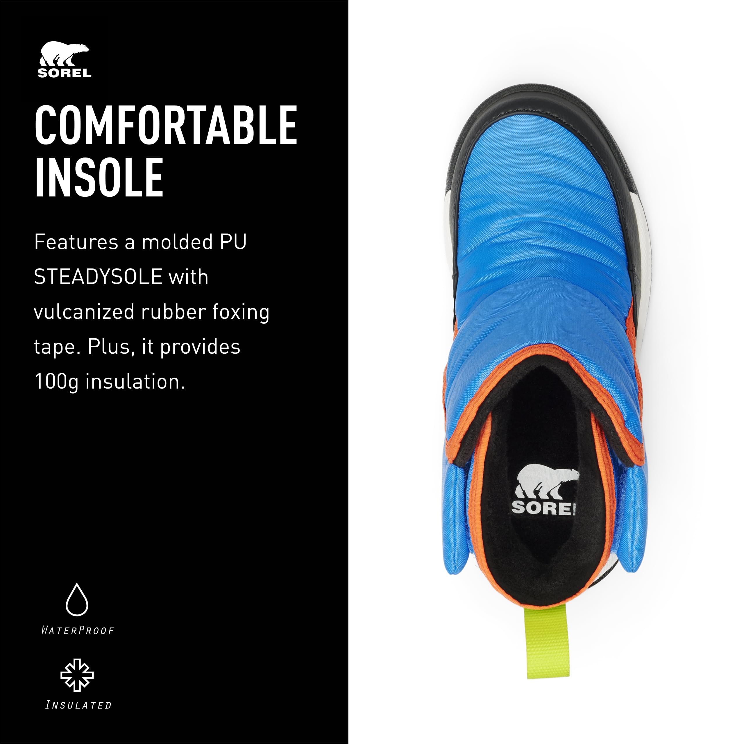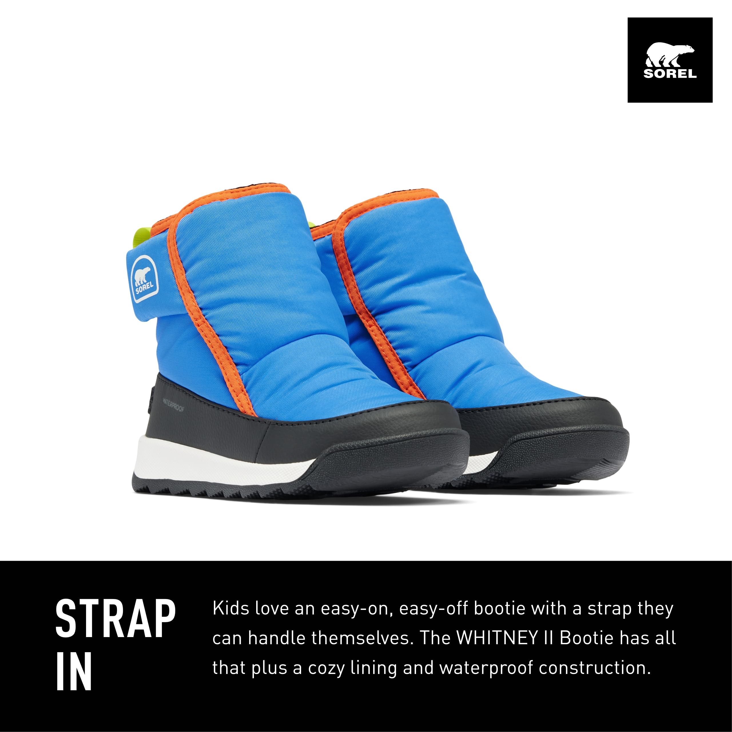 Description STRAP IN Kids love an easy-on, easy-off bootie with a strap they can handle themselves. The WHITNEY™ II Bootie has all that plus a cozy lining and waterproof construction. Other features of the TODDLER WHITNEY™ II Bootie Plus include: