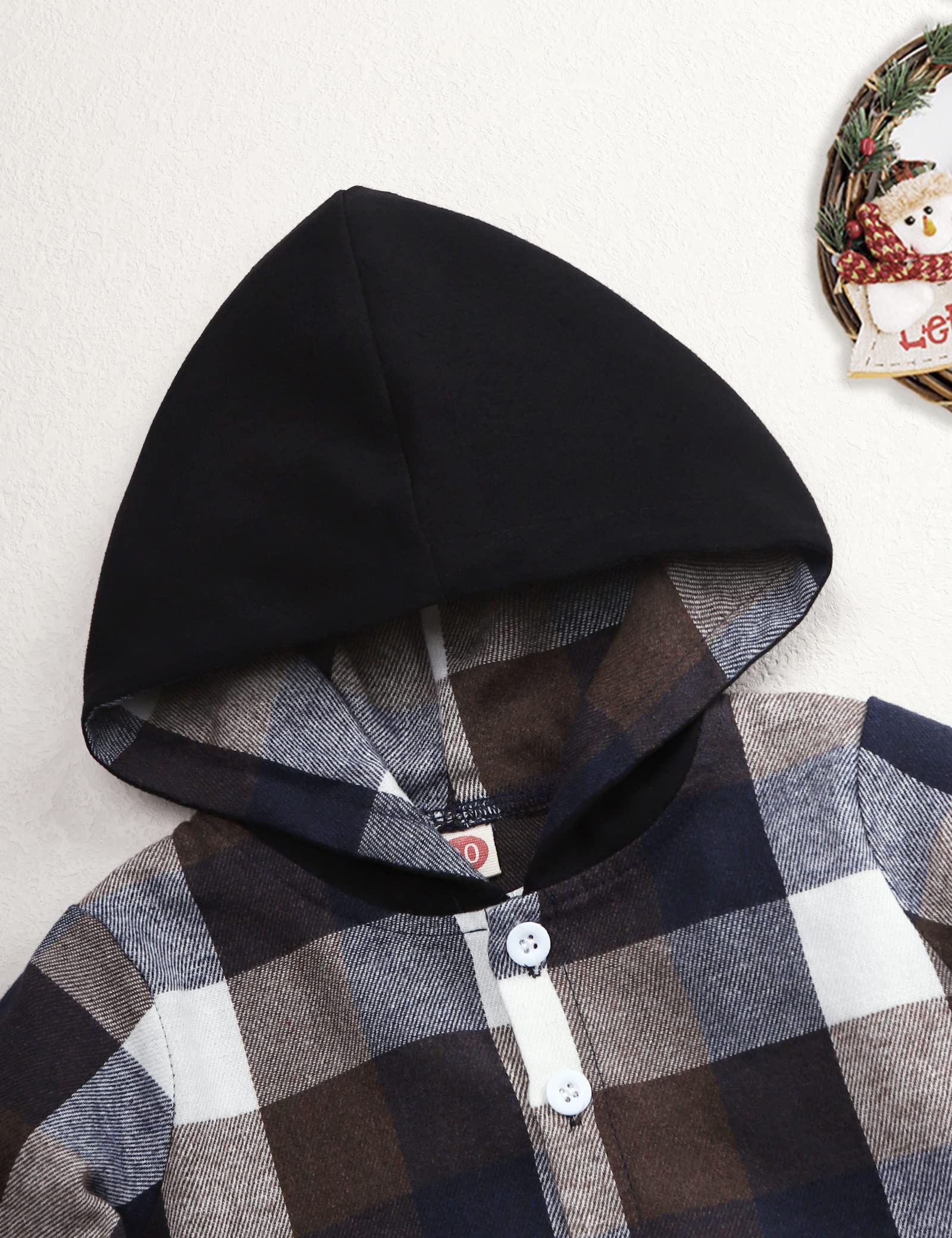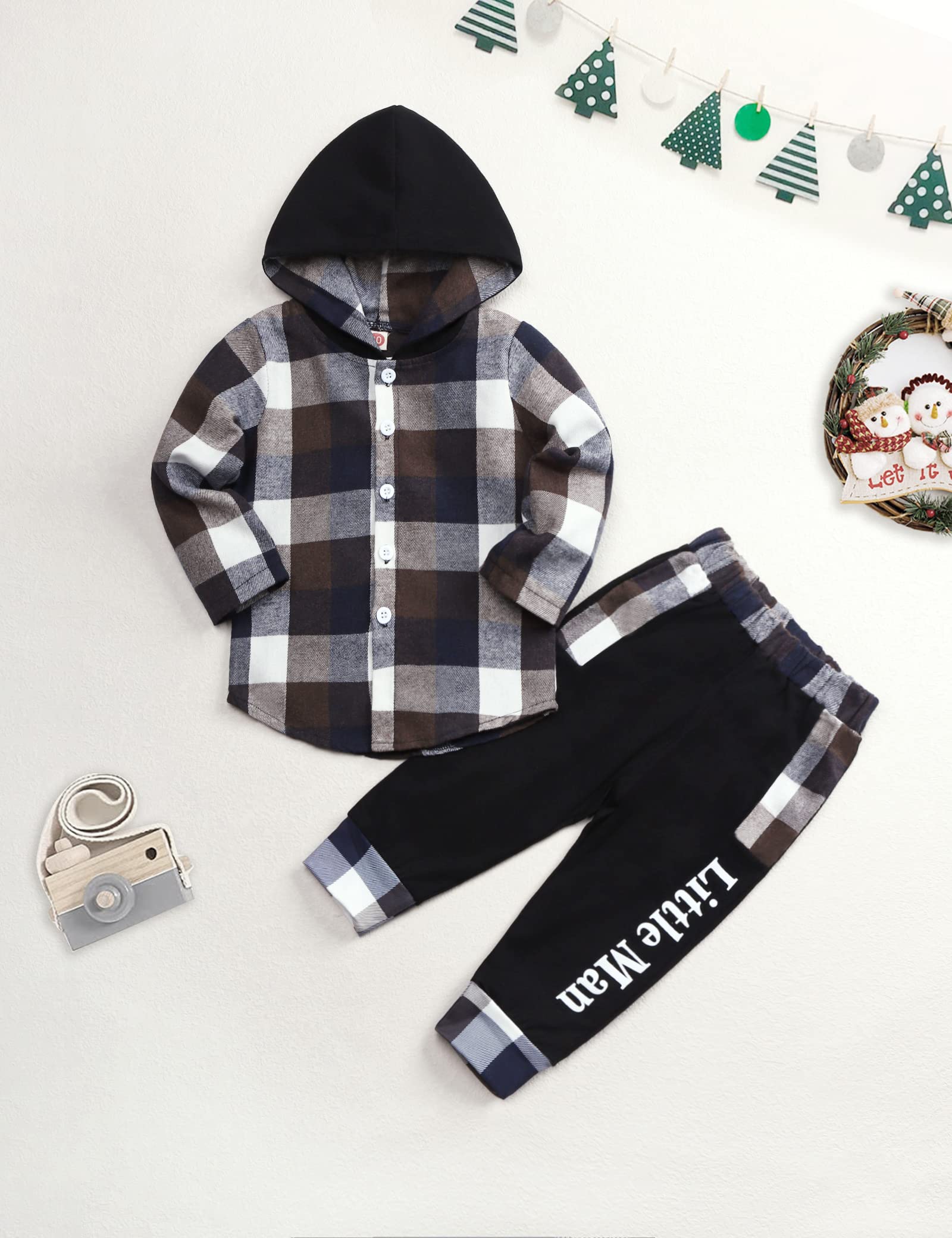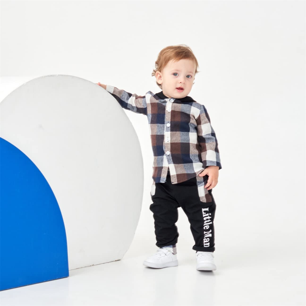 Cute & Stylish Design: Toddler Baby boy clothes set with layer of fleece on the inside, Classical plaid colorblock hoodie with special button design, elastic waistband plaid pants match with letter printed , easy to wear.