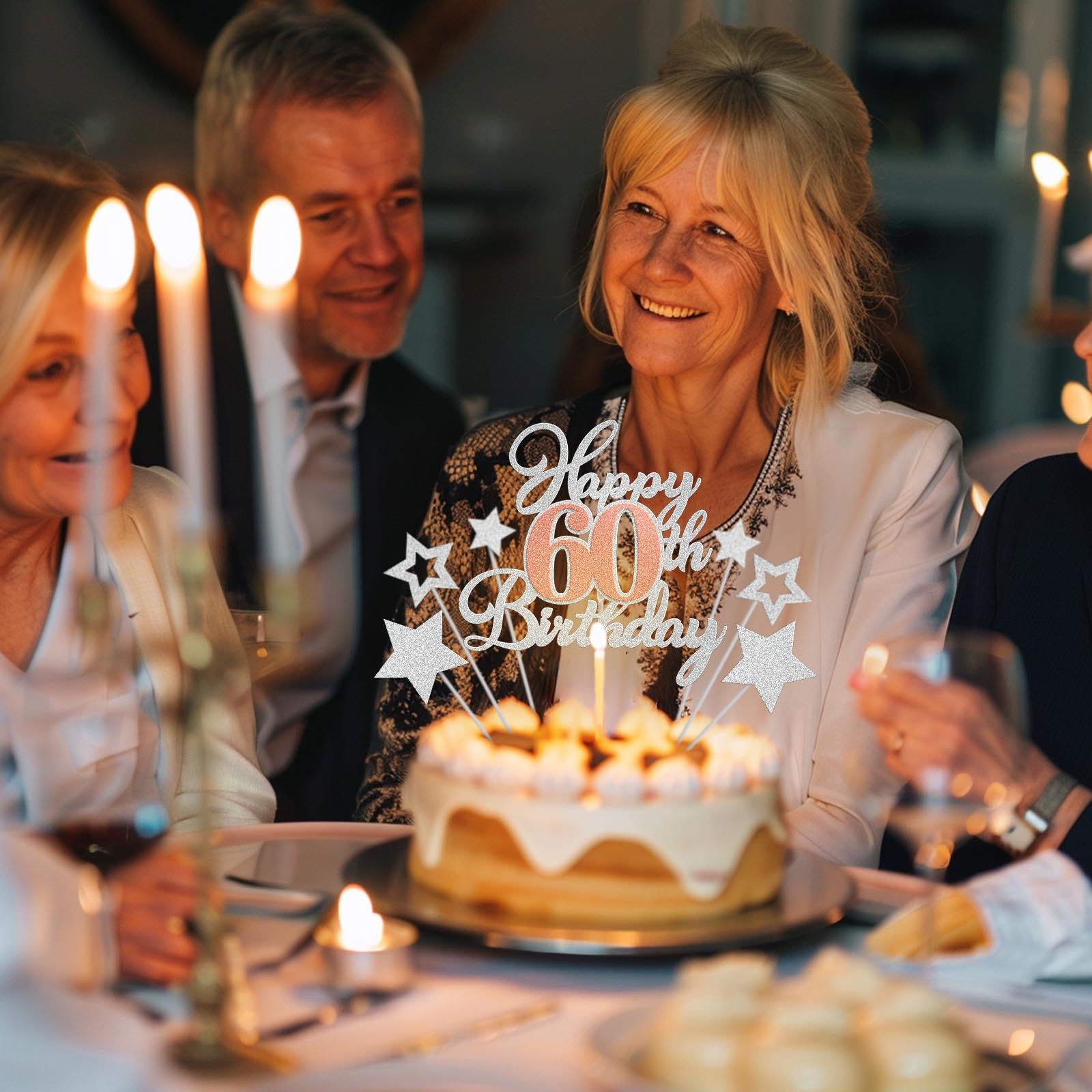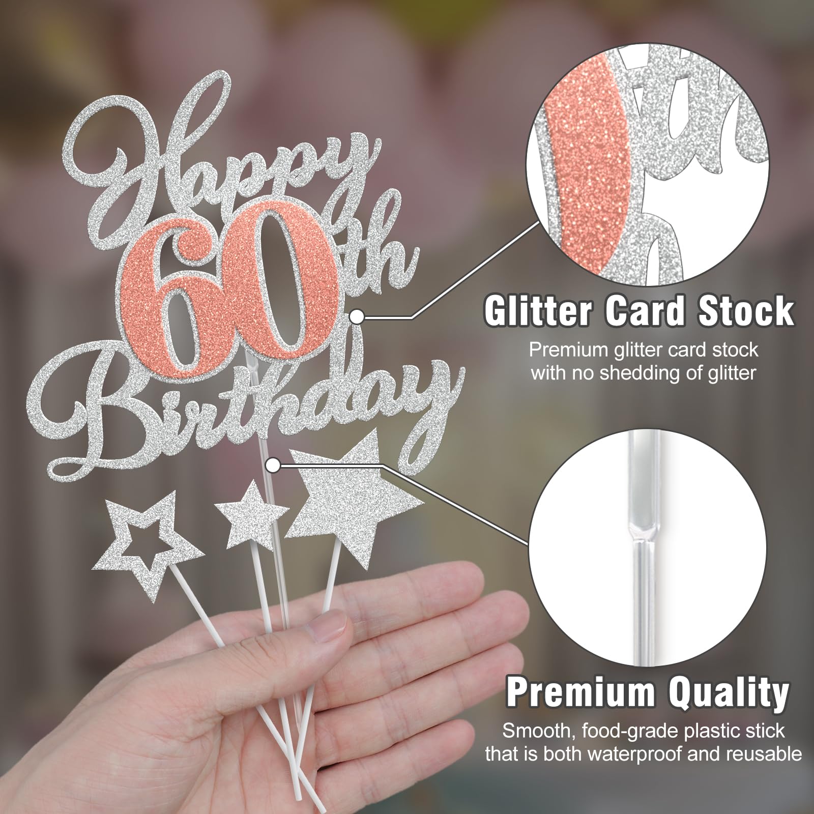Stylish and Elegant Design: Happy 60th Birthday cake topper with star decorations, crafted from the same glitter card stock, shines brightly, bringing a unique charm to any birthday cake, making it more elegant, eye-catching, and enhancing the festive atmosphere.