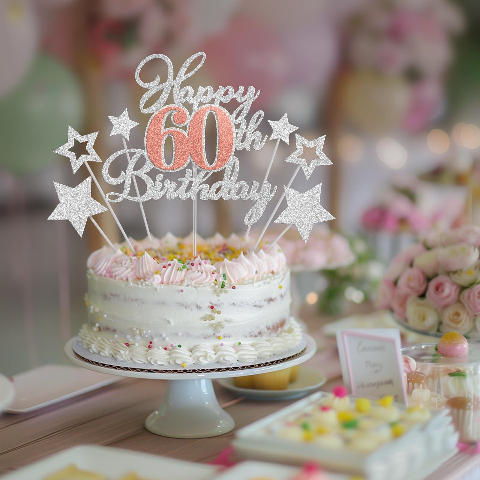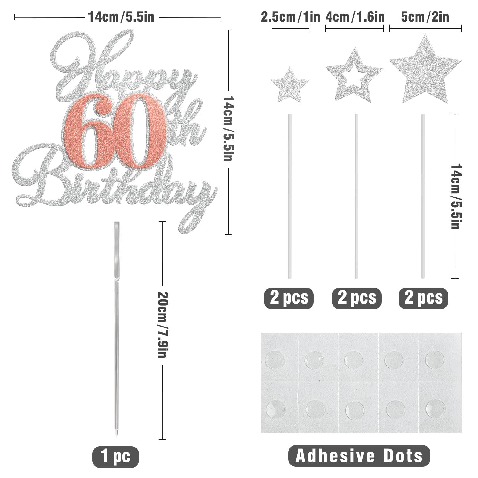 Happy 60th Birthday Cake Topper for Happy 60th Birthday Theme Party Cake Decorations Supplies. Ideal for happy 60 birthday theme party, 60th anniversary theme party cake decorations supplies. Attention: This cake topper features glitter on one side and is white on the other. It's meant for decoration only, so please do not place it in the oven or microwave. Specifications: Material: - Glitter card stock + Plastic stick - Adhesive dots Package Includes: - 1 pc Happy 60th Birthday cake topper - 1 pc Food-Grade clear plastic stick - 6 pcs Silver glitter stars - 6 pcs White plastic sticks - 10 pcs Adhesive dots