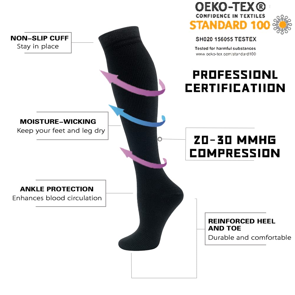 SOCKS FOR WOMEN: 20-30mmHg circulation compression socks are with moderate compression and are recommended by doctors and trainers. Nurse compression socks create the highest support pressure at the ankle and gradually decrease along the legs, making your legs more comfortable.