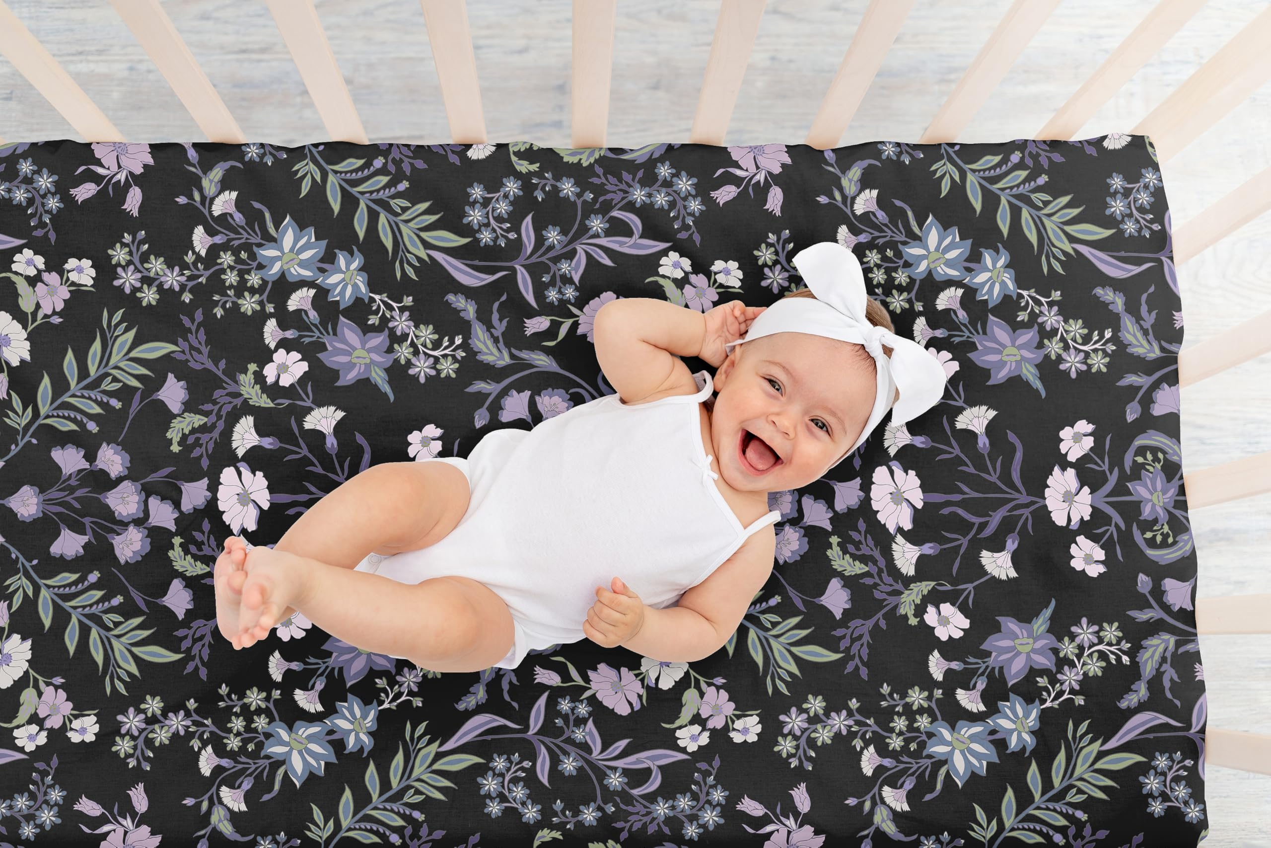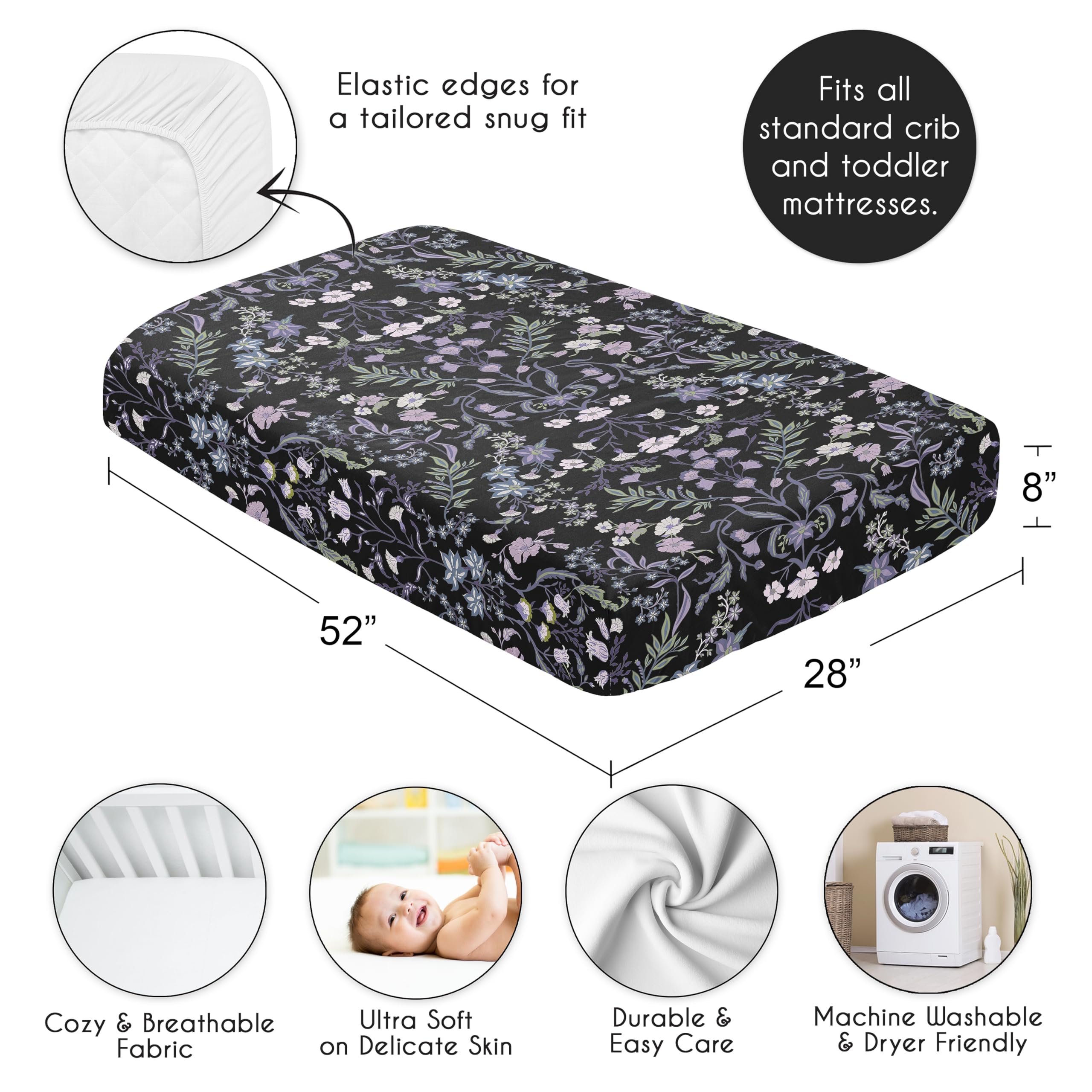 SNUG FIT: Includes (1) Fitted Crib Sheet 52in. x 28in. x 8in. Our newborn standard crib sheets fit snugly, with premium elastic sewn around the entire bottom edge for a secure fit on most standard sized cribs & toddler beds, to reduce shifting & bunching. This brushed microfiber crib sheet features an exclusive design of a black, periwinkle, teal & turquoise botanical leaf, garden, indie, rustic, daisy leaves wild floral print & is gentle on delicate skin to foster a soothing sleep environment.