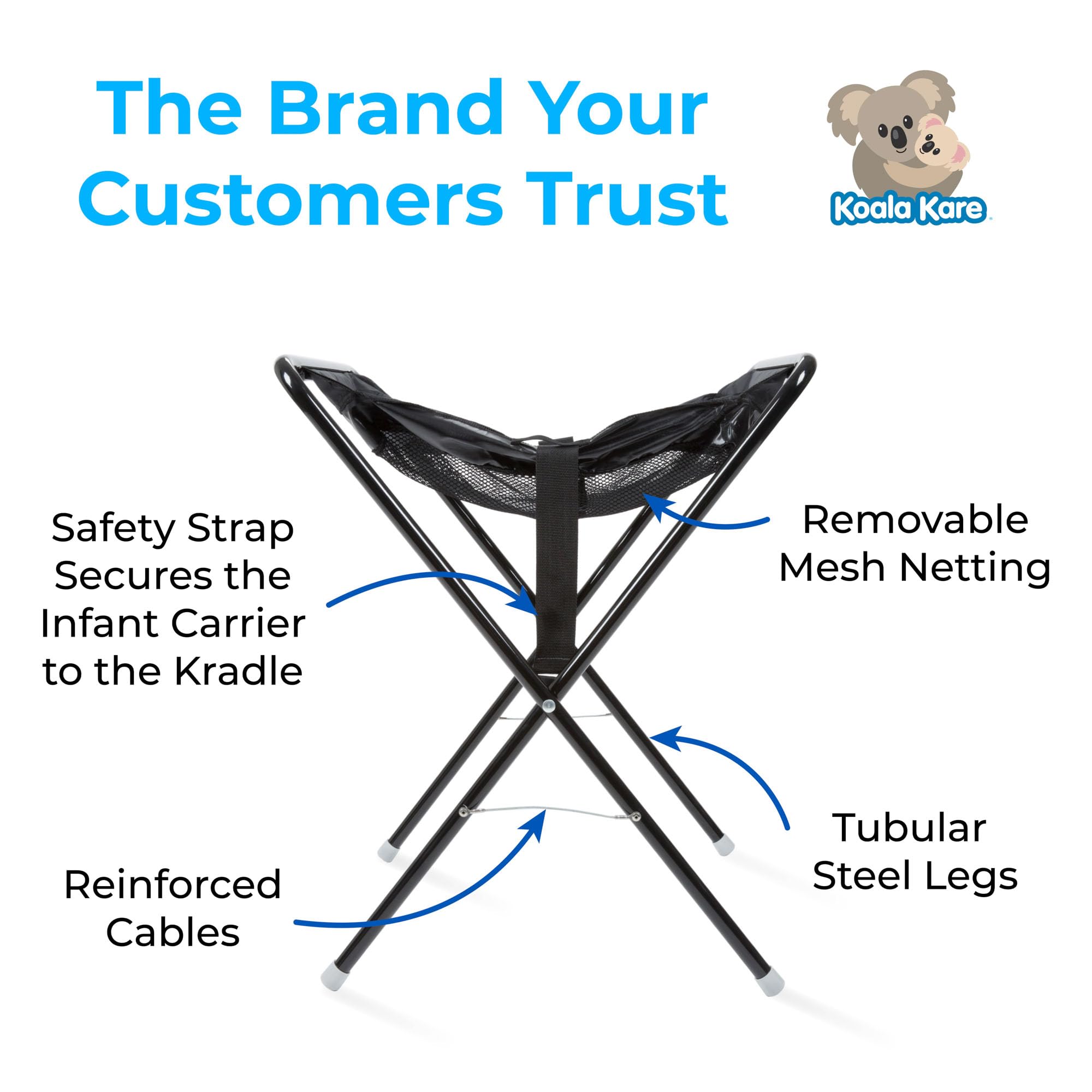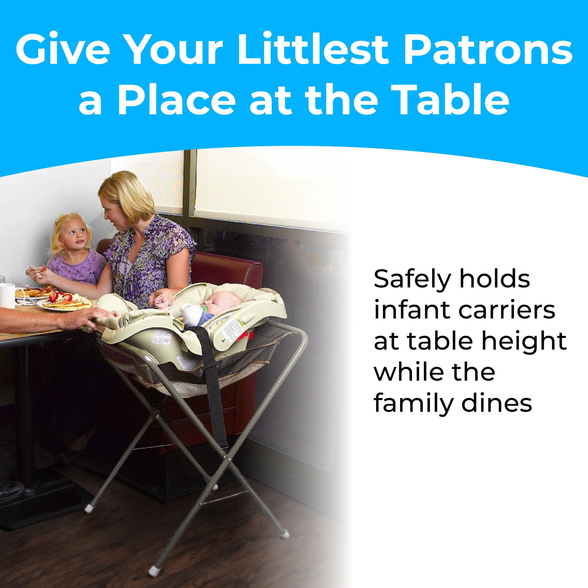 Introducing the KoalaKare Infant Seat Kradle – the ultimate solution for restaurants and cafés that prioritize safety, convenience, and style. This innovative table-height infant carrier holder is designed to provide families with a safe and comfortable dining experience, making it the perfect addition to any family-friendly establishment. With the KoalaKare Infant Seat Kradle, you can eliminate the risky practice of balancing infant carriers on upside-down high chairs and offer your patrons a more secure seating option. Built with reinforced tubular steel legs and cables, the KoalaKare Infant Seat Kradle ensures maximum strength and durability, making it a reliable choice for holding infant carriers. The sturdy frame provides a stable base, giving parents peace of mind as they dine with their little ones. This high-quality construction is designed to withstand the demands of busy dining environments, ensuring long-lasting performance. The lightweight, foldable design of the KoalaKare Infant Seat Kradle makes it incredibly easy to store and transport. When not in use, simply fold the Kradle into a compact size and store it away, helping you maintain an organized and efficient dining area. This space-saving feature is especially valuable for restaurants with limited storage space, allowing you to maximize seating capacity without sacrificing safety. One of the standout features of the KoalaKare Infant Seat Kradle is its removable mesh holder. The mesh portion can be easily detached and machine washed, ensuring your seating option remains clean, hygienic, and ready for the next use. This practical feature is ideal for maintaining high standards of cleanliness in a dining setting, especially in establishments with high customer turnover. Available in three stylish color options, the KoalaKare Infant Seat Kradle is designed to complement modern restaurant décor, enhancing the overall ambiance of your establishment. Its sleek and contemporary look fits seamlessly into any environment, making it a versatile addition to your seating options. Invest in the KoalaKare Infant Seat Kradle to provide a safer, more convenient, and stylish dining experience for families. By offering a secure solution for infant carriers, you’ll ensure your restaurant stands out as a top choice for parents, delivering a welcoming and enjoyable experience for all guests.