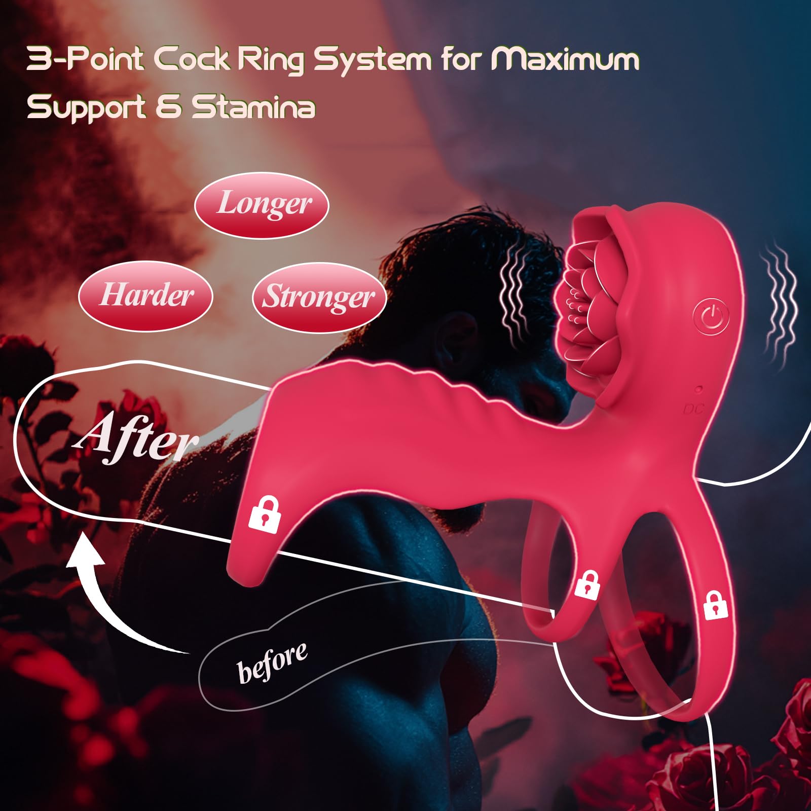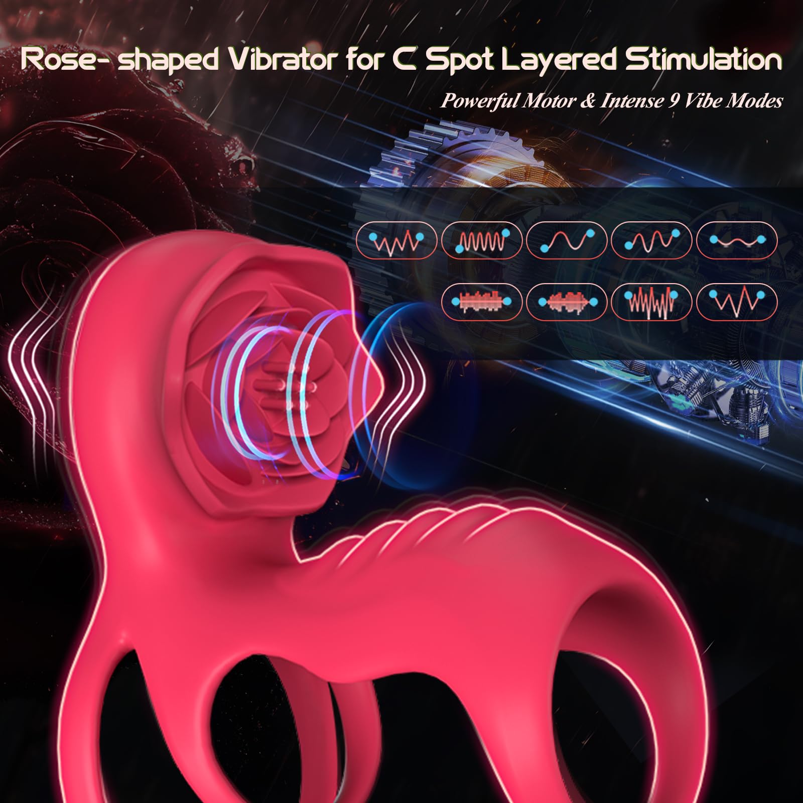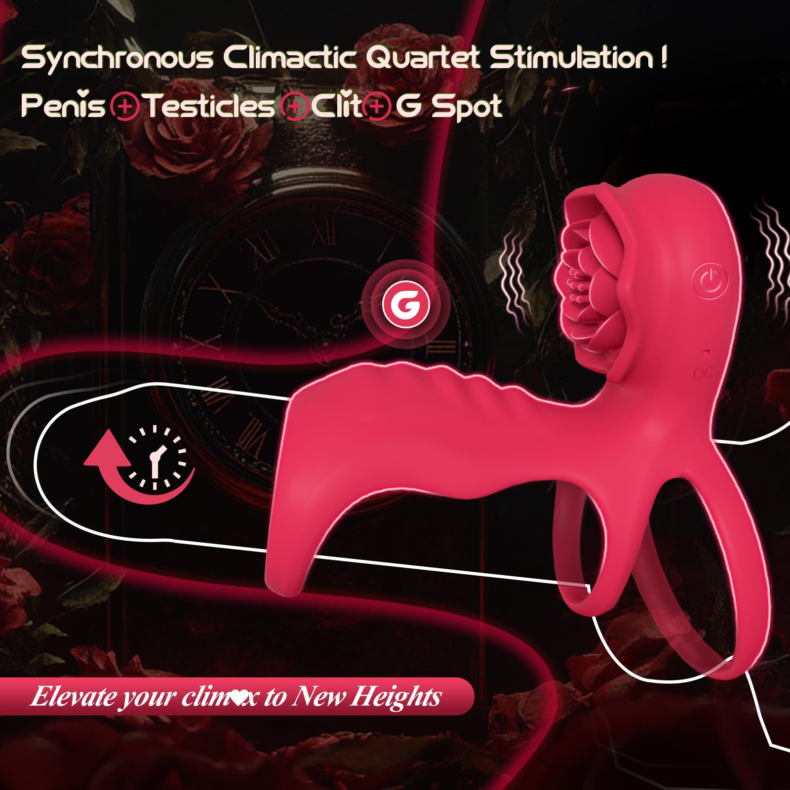 Synchronous Quartet Stimulus for Penis, Testicles, C Spot, and G Spot: Every thrust ignites four zones at once: 3 rings grip his shaft and balls, the rose hums on her C spot, and the front tip teases her G spot. The same rhythm runs through both bodies—tight, deep, and impossibly climaxes synced