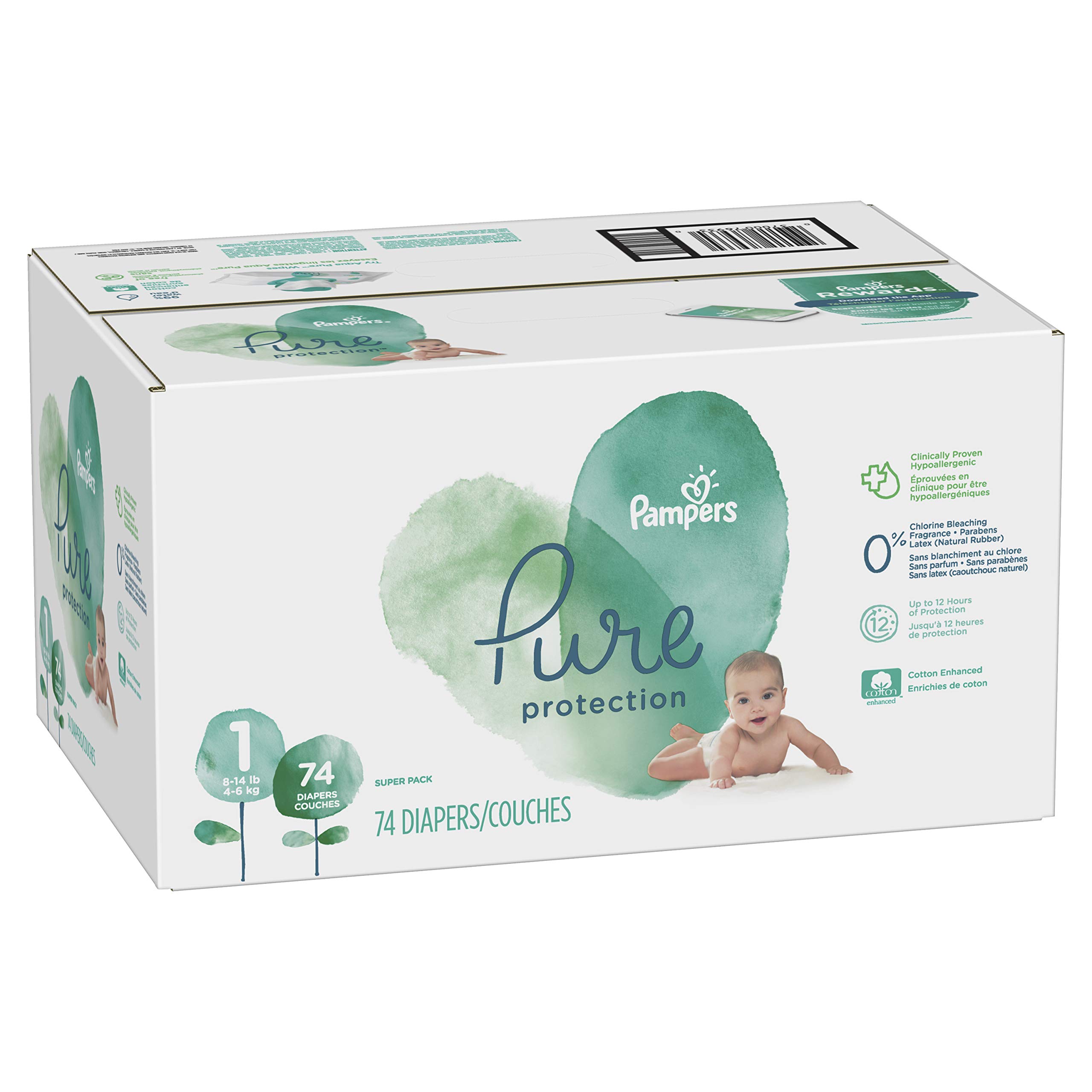 Pampers Pure Protection diapers help protect your babyβs skin with 0% chlorine bleaching and 100% Pampers protection. They are made without chlorine bleaching, fragrance parabens, latex*, and EU 26 allergens. Crafted with premium cotton, soft plant-based fibers, and other thoughtfully selected materialsβtheyβre clinically proven hypoallergenic for your babyβs delicate skin.Because your baby deserves skin-loving care without compromises, Pampers Pure Protection delivers up to 12 hours of trusted leak protection. They have features you and your baby will love, like adorable prints and our reassuring Wetness Indicator. And Pampers Pure Protection diapers are made with 100% certified renewable electricity and sustainably sourced wood pulp.*Natural rubber latexThe Seal of Cotton and cotton enhanced are trademarks of Cotton Incorporated. cotton enhanced soft outercover contains 15% cotton.