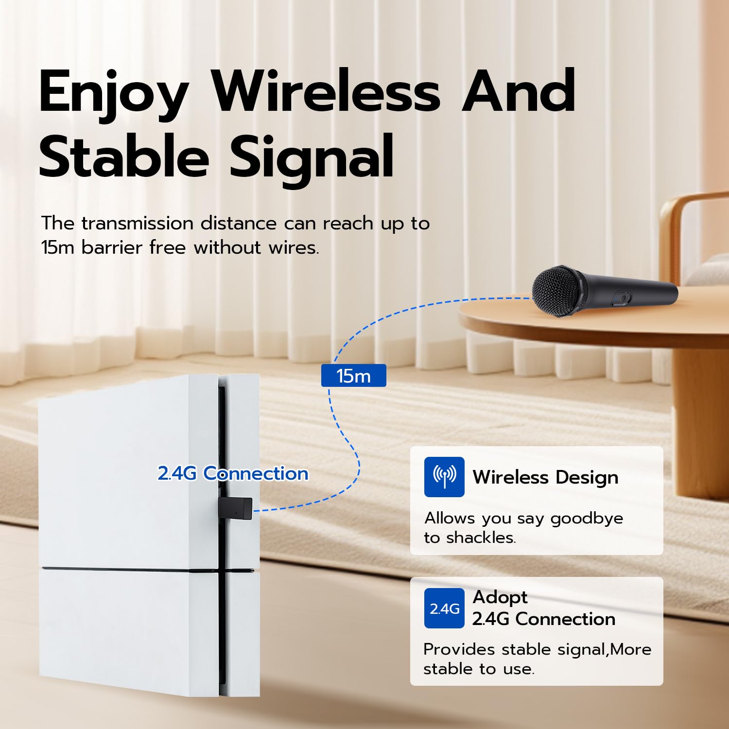 25ms low latency provides undistorted sound quality. Adopt 2.4G connection provides stable signal. More stable to use. The transmission distance can reach up to 15m barrier free without wires.