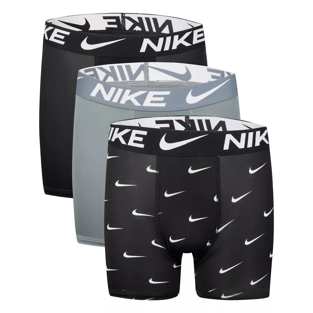 Description Everyday comfort gets a performance upgrade with this three-pack of Nike Essentials Dri-FIT Boxer Briefs. Each pair is made with soft, lightweight polyester that includes recycled fibers, combining sustainable design with reliable durability. Nike’s Dri-FIT technology pulls sweat away from the skin, helping keep kids cool and dry whether they’re active or relaxing. The stretch construction moves naturally, while the smooth waistband offers a secure fit that stays in place all day. Flat seams reduce distractions, giving a comfortable feel against the skin. Each pack includes a mix of solid styles and a printed design for variety, all finished with Nike branding for a sporty touch. Built to withstand repeated washes while maintaining their shape, these boxer briefs deliver the dependable comfort, function, and style that parents value and kids can trust.