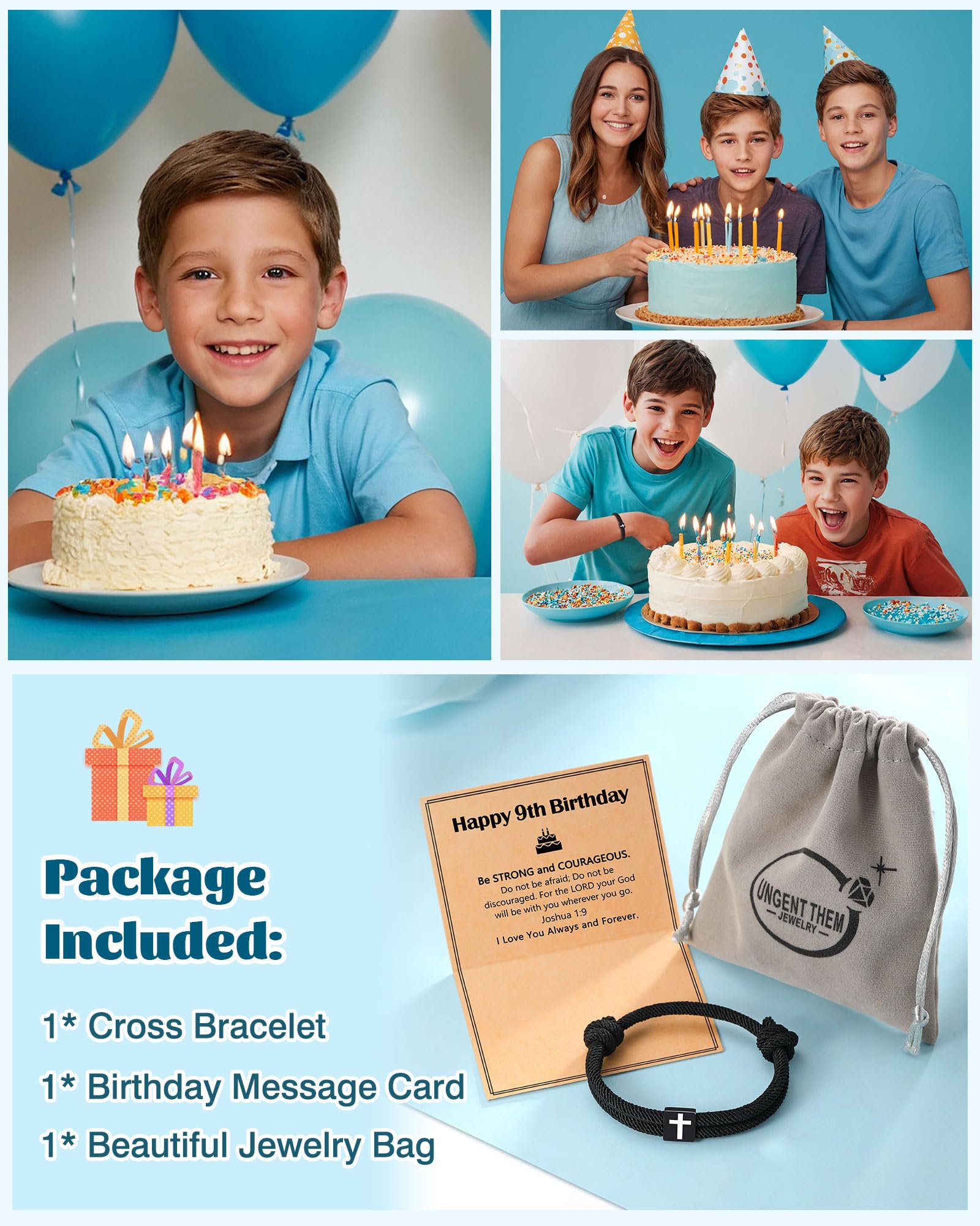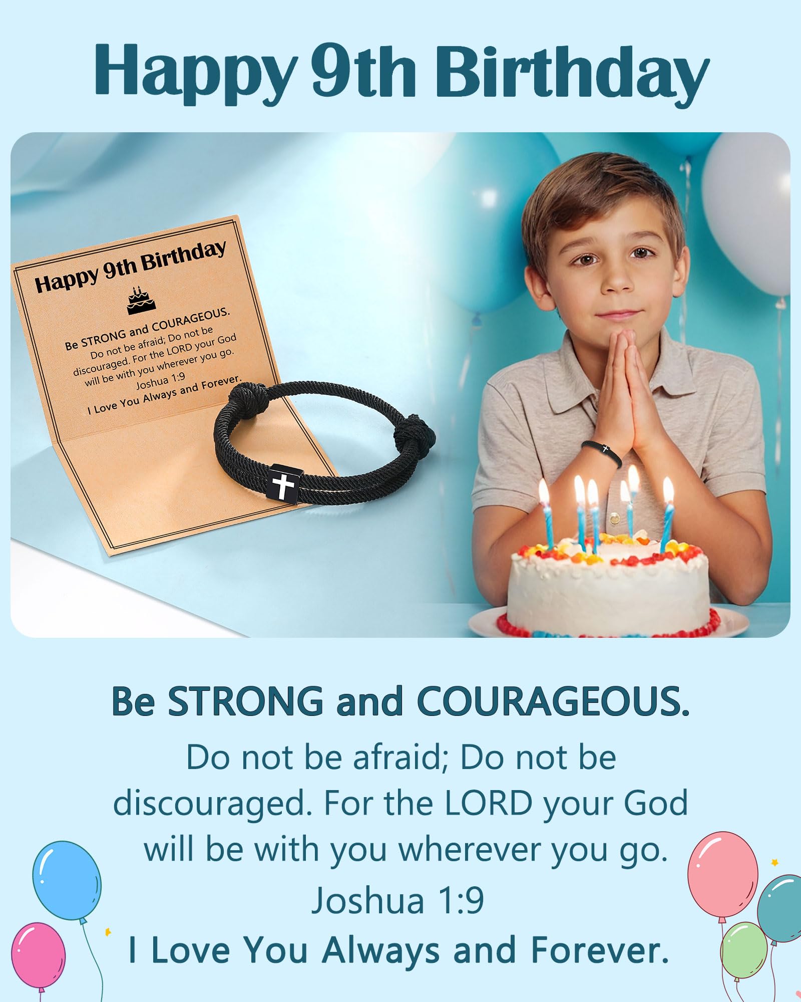 【9 Year Old Birthday Gifts】Happy birthday! Celebrate his birthday with this black cross bracelet, it Includes another thoughtful birthday blessing, “I Love You Always and Forever,” which combines love and encouragement.