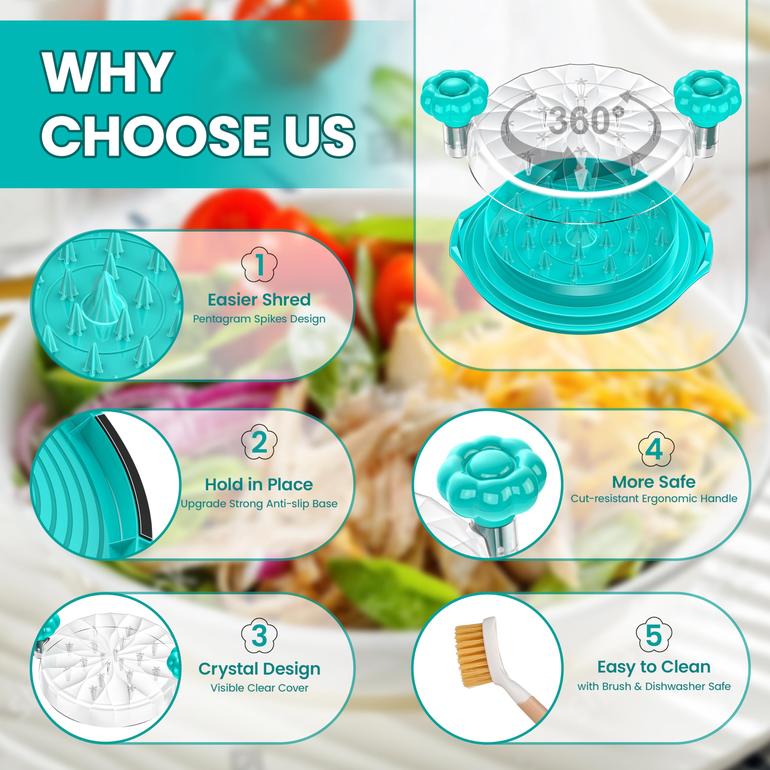【Multiple Colors & Flower Design】The meat chicken shredder tool twist has various rich colors,included 4 popular colors, 3 bright & vibrant dopamine colors. The transparent flower design with a lid allows you to see the shredding process, ensuring the desired consistency is achieved.