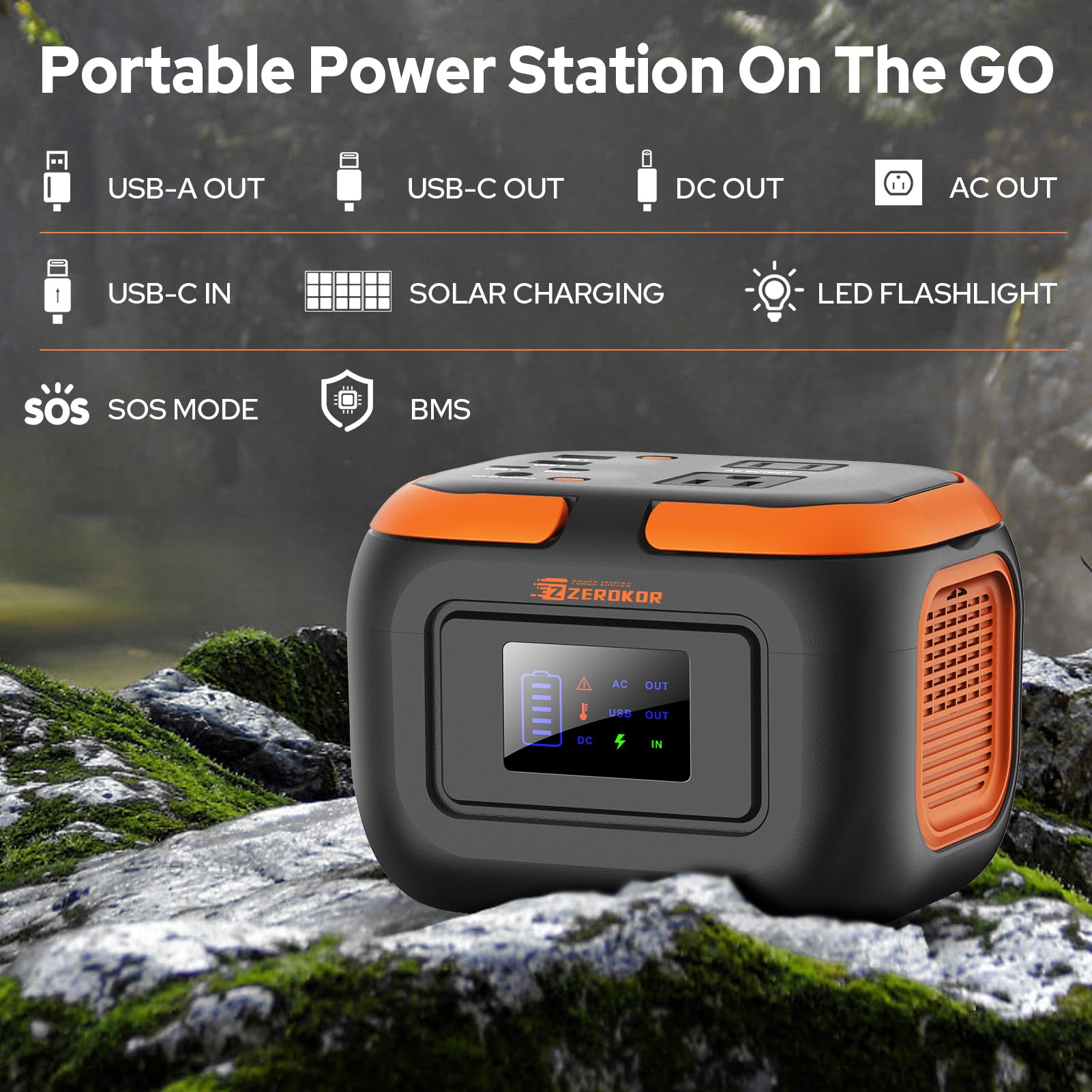 🌍Multiple Charging Ports, Compact Power Station: with 2* 120W MAX AC Outlets, 1* DC (12V~16.8V/6A MAX), USB1*5V/2.4A Max, 1*QC USB2 (5V/3.1A 9V/2A 12V/1.5A MAX), 1* USB-C (5V/3.1A 9V/2A 12V/1.5A MAX), ZeroKor Portable Power Station is powerful enough to power your smartphone, tablet, laptop, camera, drones and more. LED Flashlight with reading mode , SOS mode for emergency,the Portable Power Station is designed for home power failure and outdoor activities (NOTE:Long press the DC button to enable the portable generator)