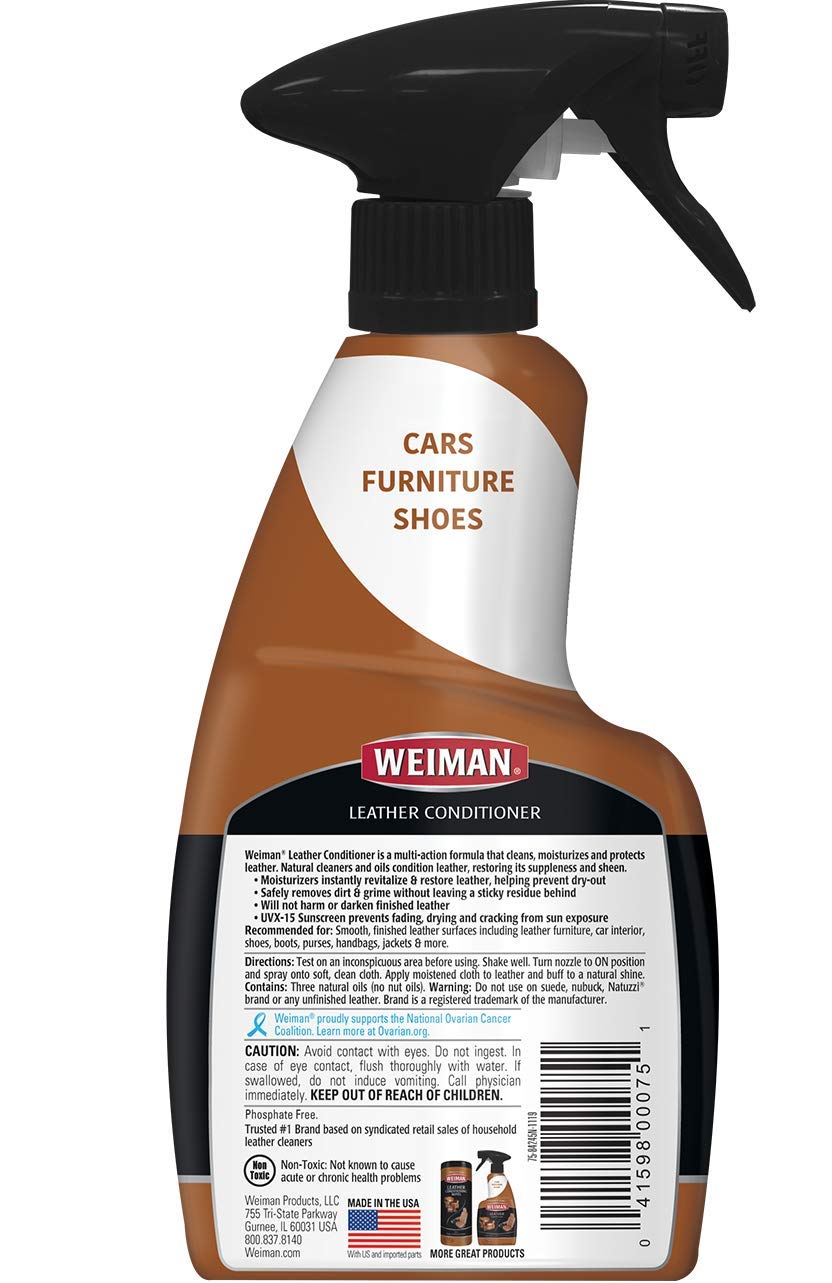 Weiman Leather Cleaner & Conditioner allows you to clean, condition and protect smooth finished leather surfaces, providing UV protection & long lasting leather restoration in just one simple step. From shoes to accessories to car interiors, our formula rejuvenates leather with natural oils while safely removing dirt, soil & residue build up. Use Weiman Leather Cleaner & Conditioner spray on a regular basis to quickly & easily maintain your favorite leather accessories, as well as promoting flexibility, leaving your leather feeling and looking sharp. Six natural oils moisturize, soften & restore leather while the UVX-15 sunscreen protects it from the damaging effects of the sun. Weiman Leather Cleaner & Conditioner is a trigger spray that can be applied directly onto smooth finished leather surfaces such as coats, furniture, automobile/car interiors, motorcycle seats, briefcases, couches, shoes & purses. Weiman Products is the perfect home, chef, pro, scratch resistant, cleansing, household, professional, and at work solution for all of your cleaning and buffing needs. The best specialty cleaning products you will buy online or in a store. When cleaning is your therapy, Weiman is your method, just wipe away and not a fingerprint in site! Weiman wants each of the surfaces in your home to look its best. That’s why we have developed cleaning products that go beyond simply cleaning to beautify and protect each of your delicate, difficult to care for surfaces. From stainless steel to leather to granite, each of our products is formulated specifically for one surface and one surface only; allowing you to achieve the perfect results that your home deserves. A clean home is great, but we want it to look more than clean, we want it to look spectacular! Weiman leaves a polishing shine and acts as a protector where other cleaners do not compare.