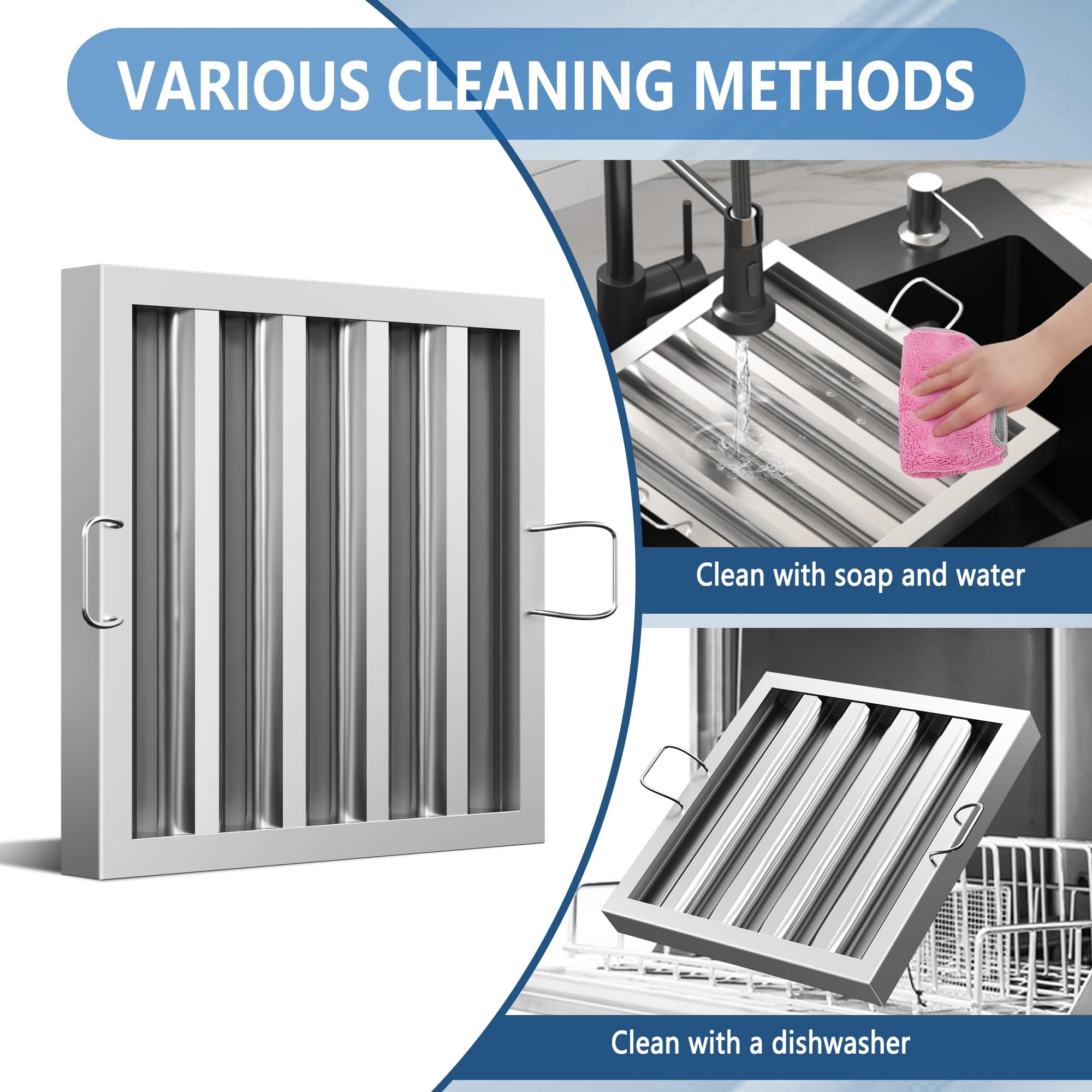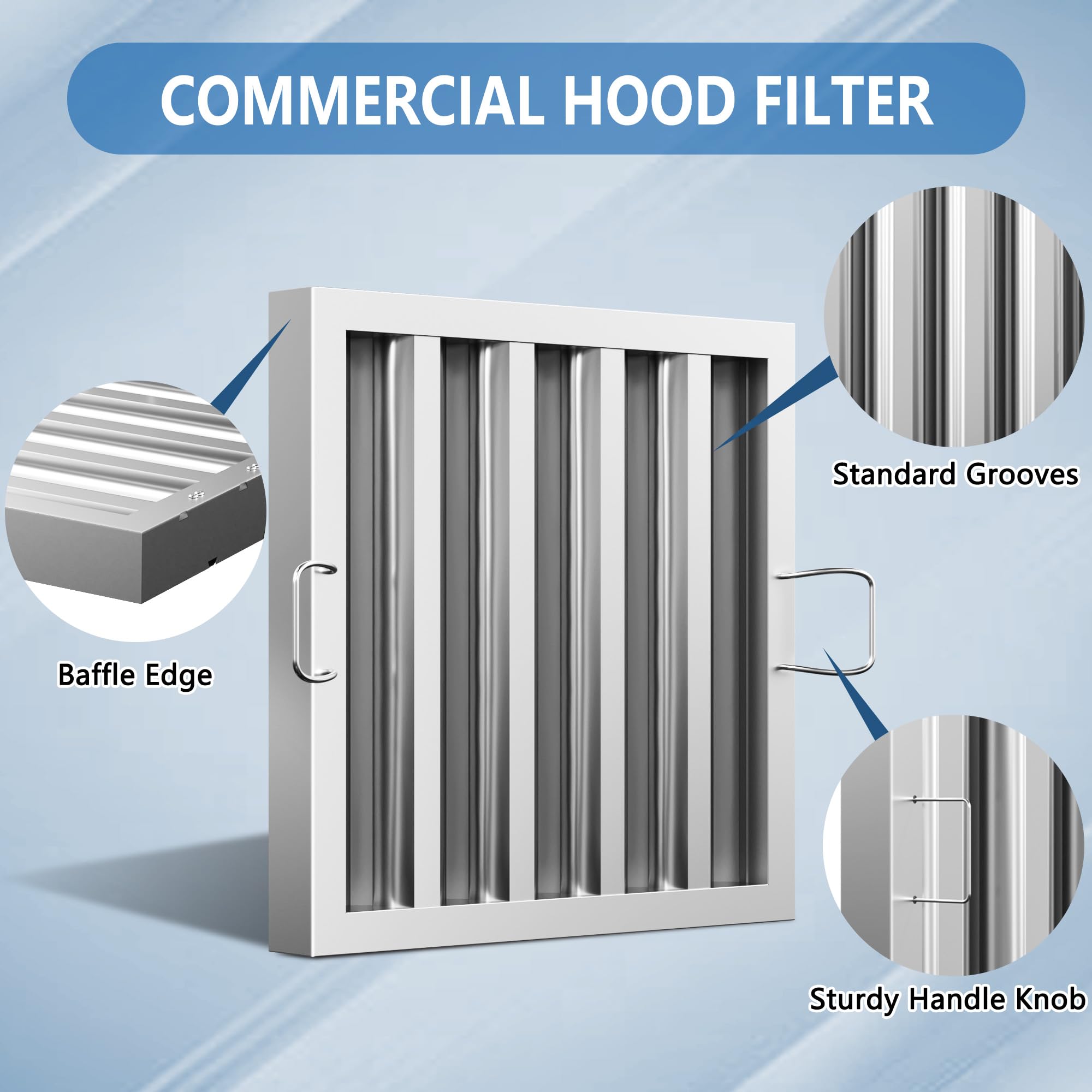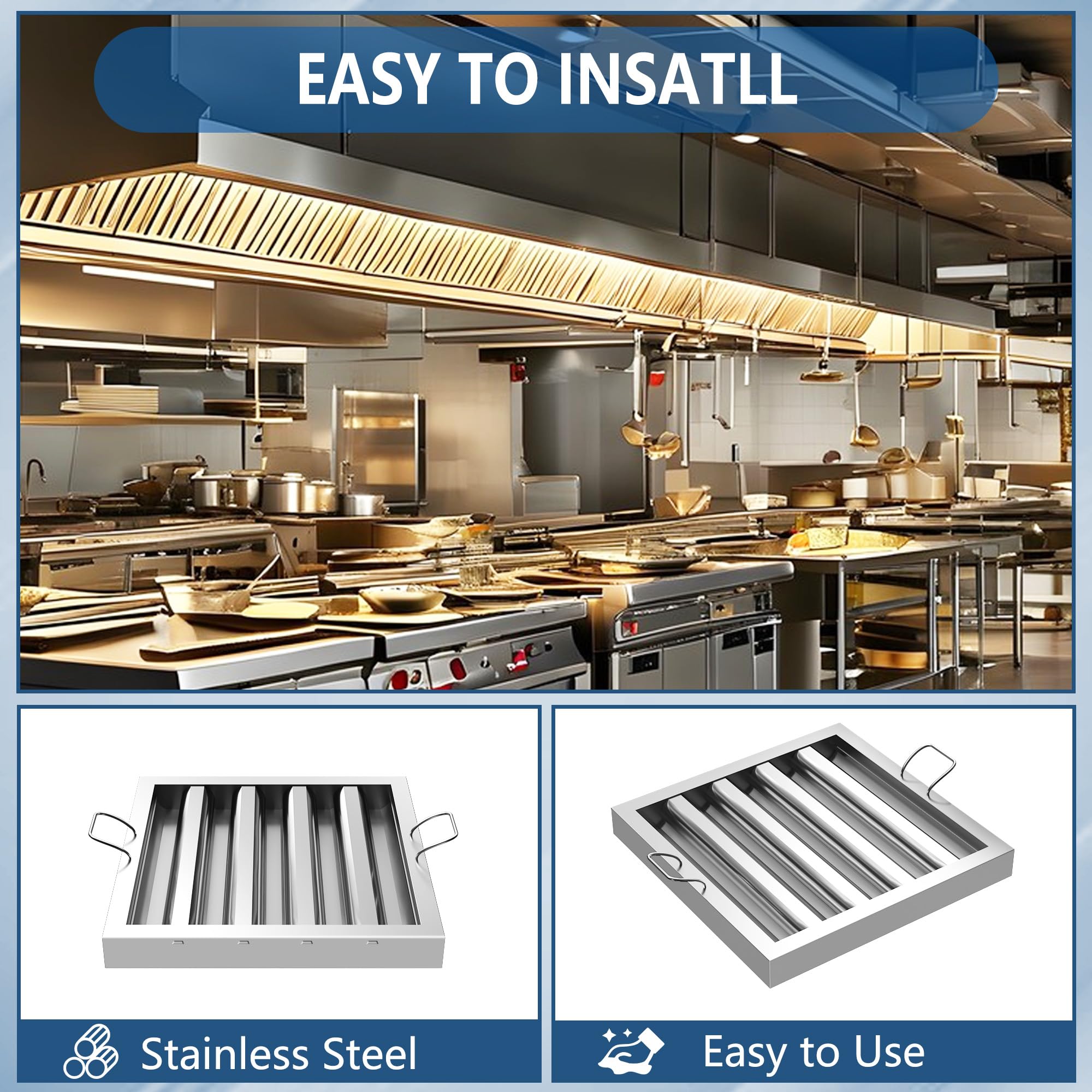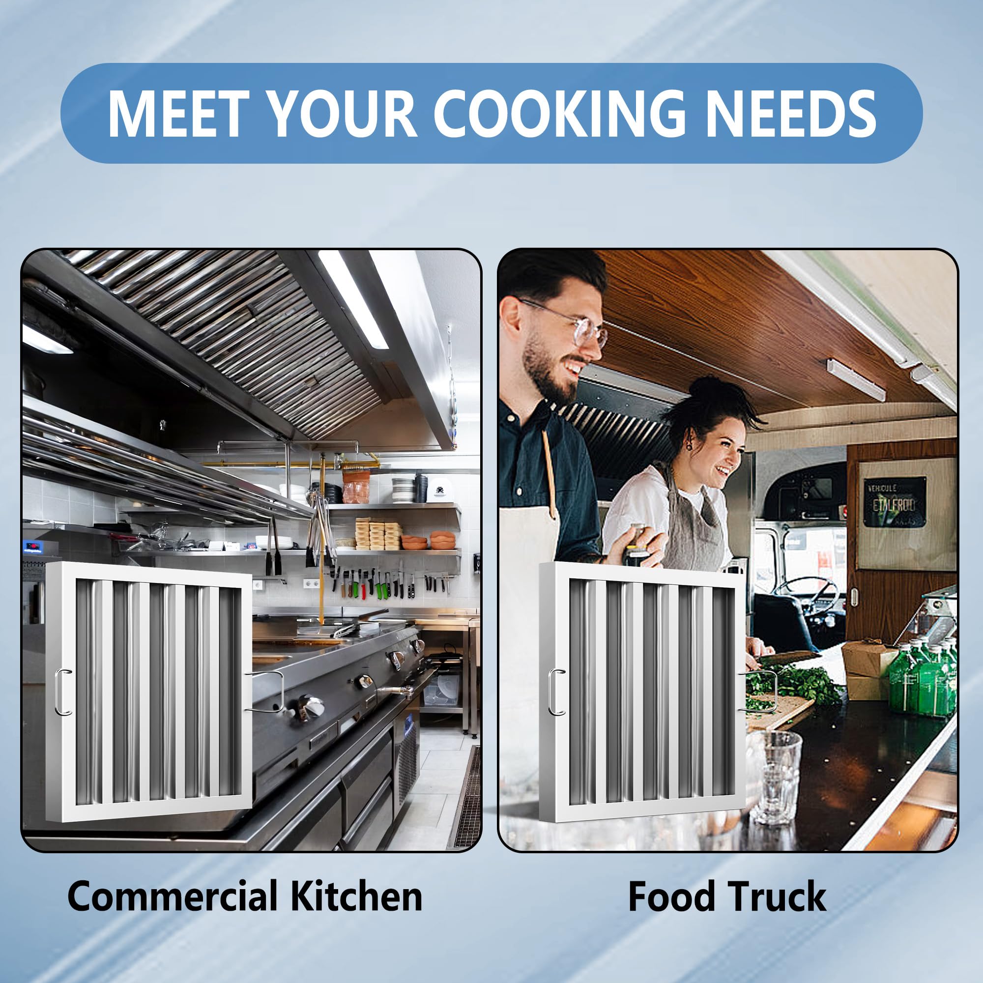 Wide Application: This stainless steel hood filter is suitable for various commercial kitchens and food trucks, helping to protect the motor and fan of the range hood from oil and smoke, which can reduce the need for expensive repairs and maintenance.