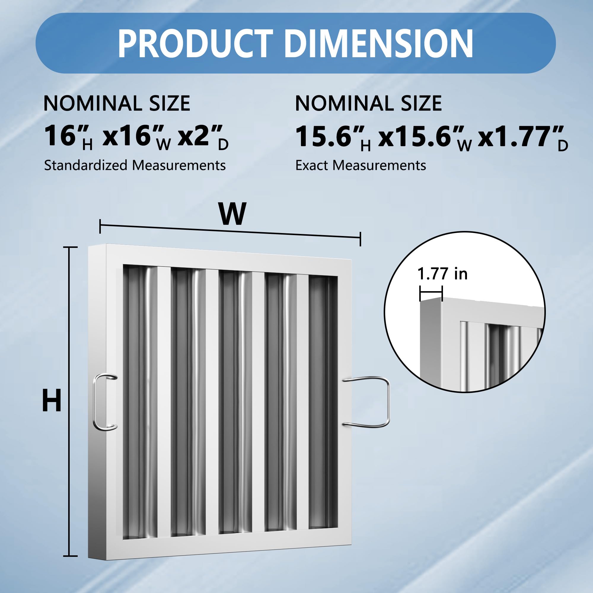Easy to Install: Handles are installed on both sides of the hood filter to facilitate the installation and replacement of the grease filter. Please carefully measure the width, height and depth of the existing filter before purchasing to ensure a perfect fit.