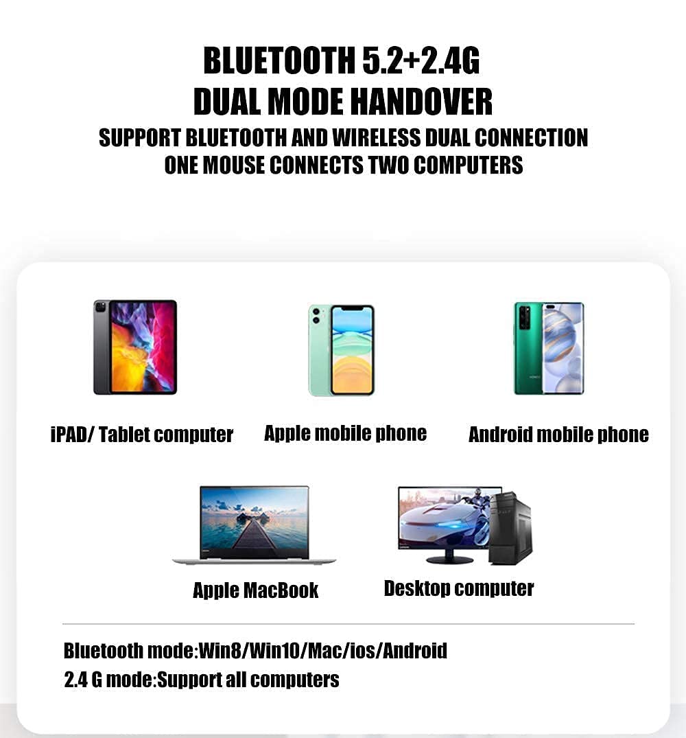 【 BLUETOOTH 5.2 + 3.0 +2.4G USB Receiver +USB C adapter Wireless Bluetooth Dual-Mode Mouse】You can switch between Bluetooth mode or 2.4G mode,Compatible systems are: iPadOS、 macOS、apple / Windows 、win7/8/10/11, UNIX, Linux, Chrome OS. ❮Bluetooth mode is available for all Bluetooth-enabled laptops, MacBook pro macbook air macbook Mac iMac (ipad pro ipad air ipad mini ipad10th iPad9th, iPhone, iMac, tablet, all-in-one computer, etc. ❯ The 2.4G USB receiver mode is suitable for all laptops, desktops, all-in-ones, Dell, HP, Mac, iMAC, etc. with USB/USB C ports.plug and play.