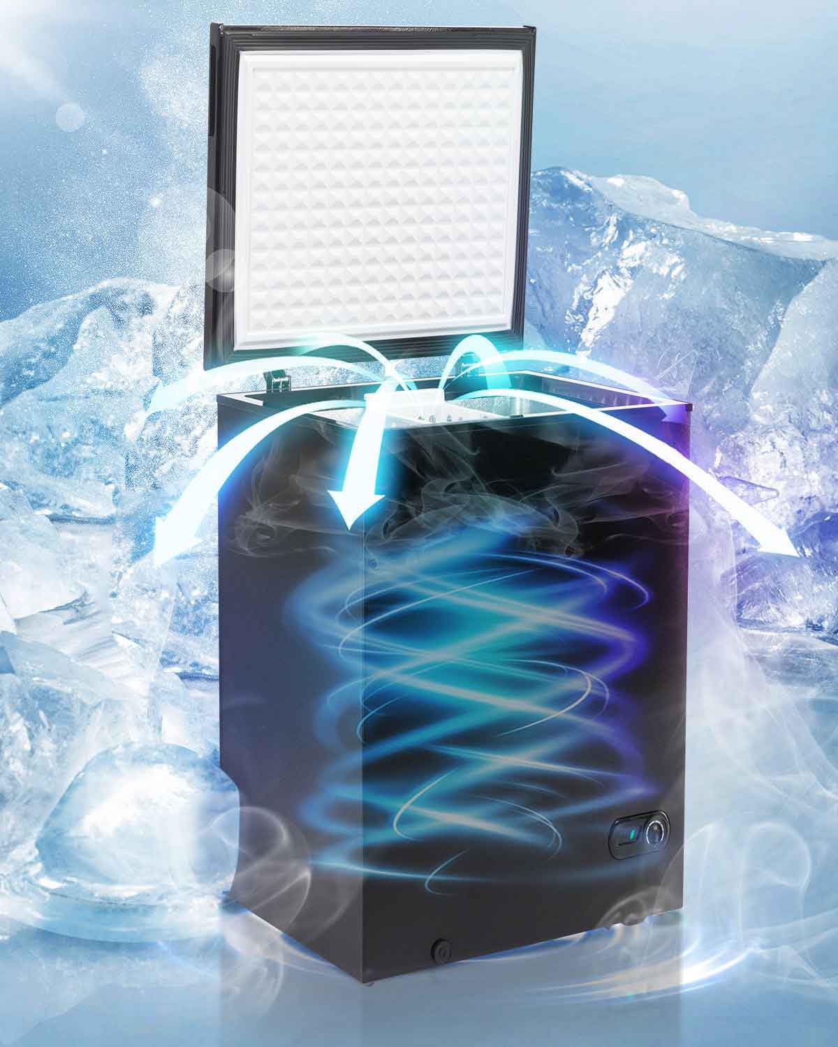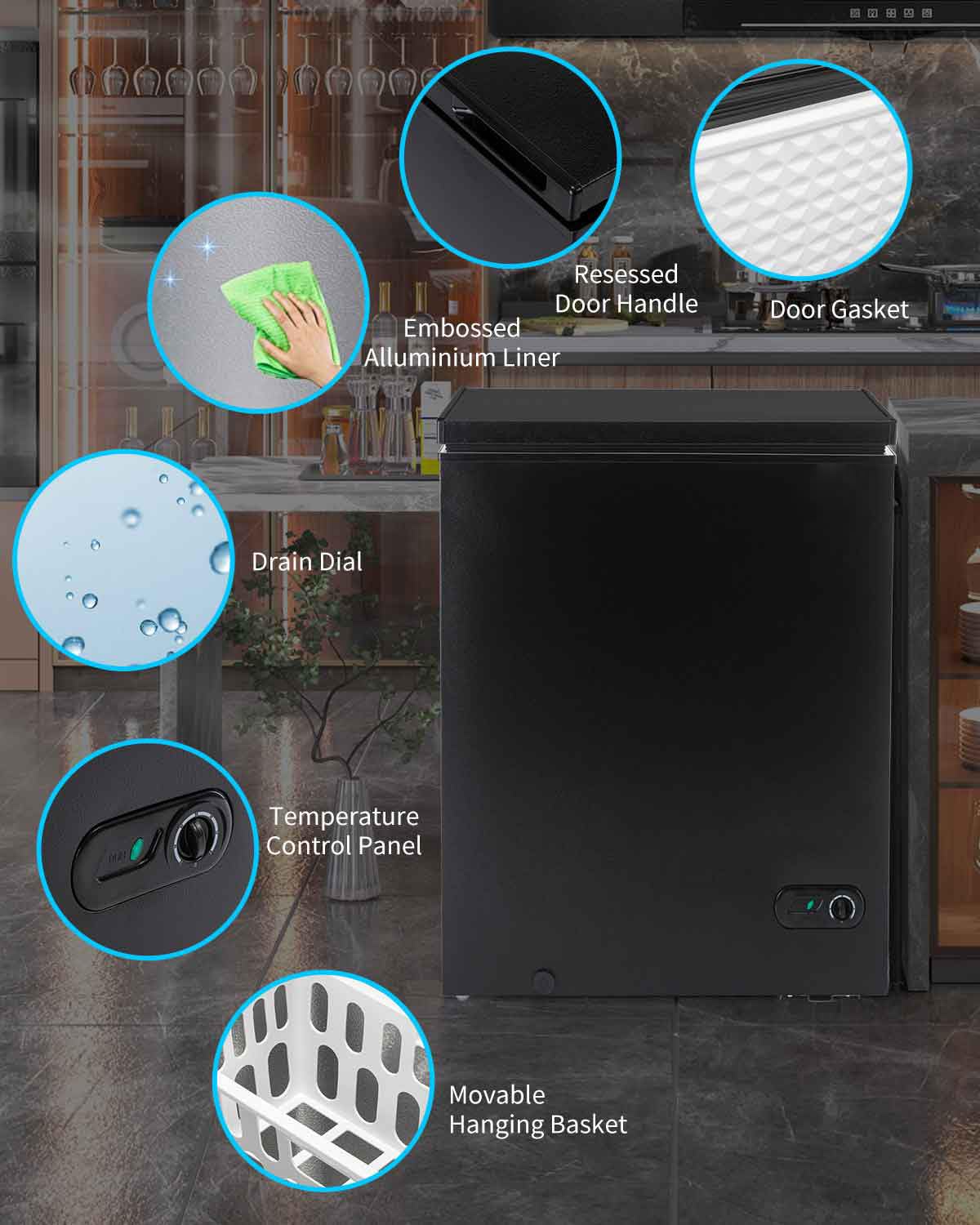 【Temperature Adjustable Control & Manual Defrost】The deep freezer is adjustable 7-level temperature control at the front of chest freezer. It can be controlled from - 7.6 ° F to 6.8 ° F (- 14 ° C to - 22 ° C). The higher the water level, the lower the temperature. Features with the Manual Defrost design, our chest freezer keeps your food fresher.