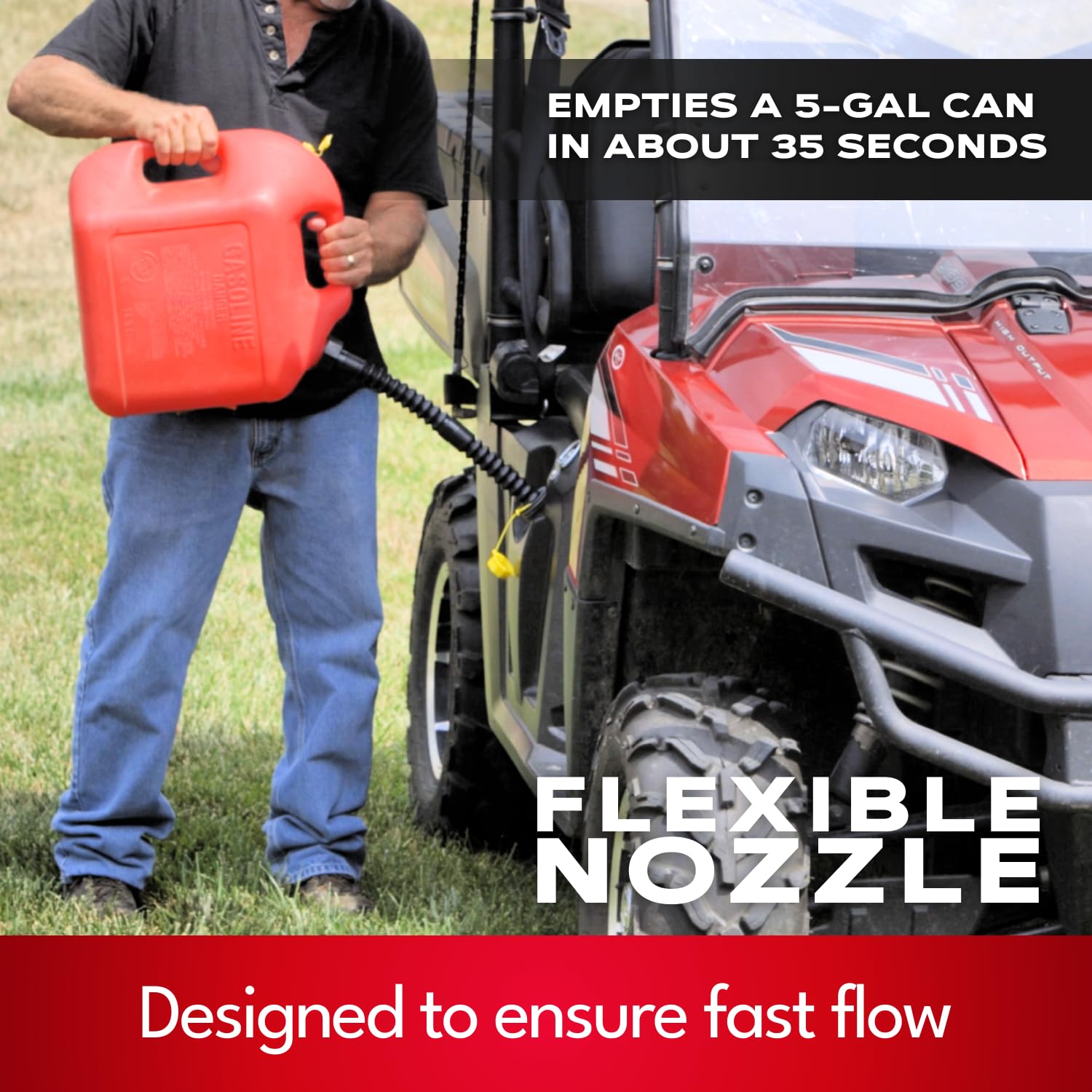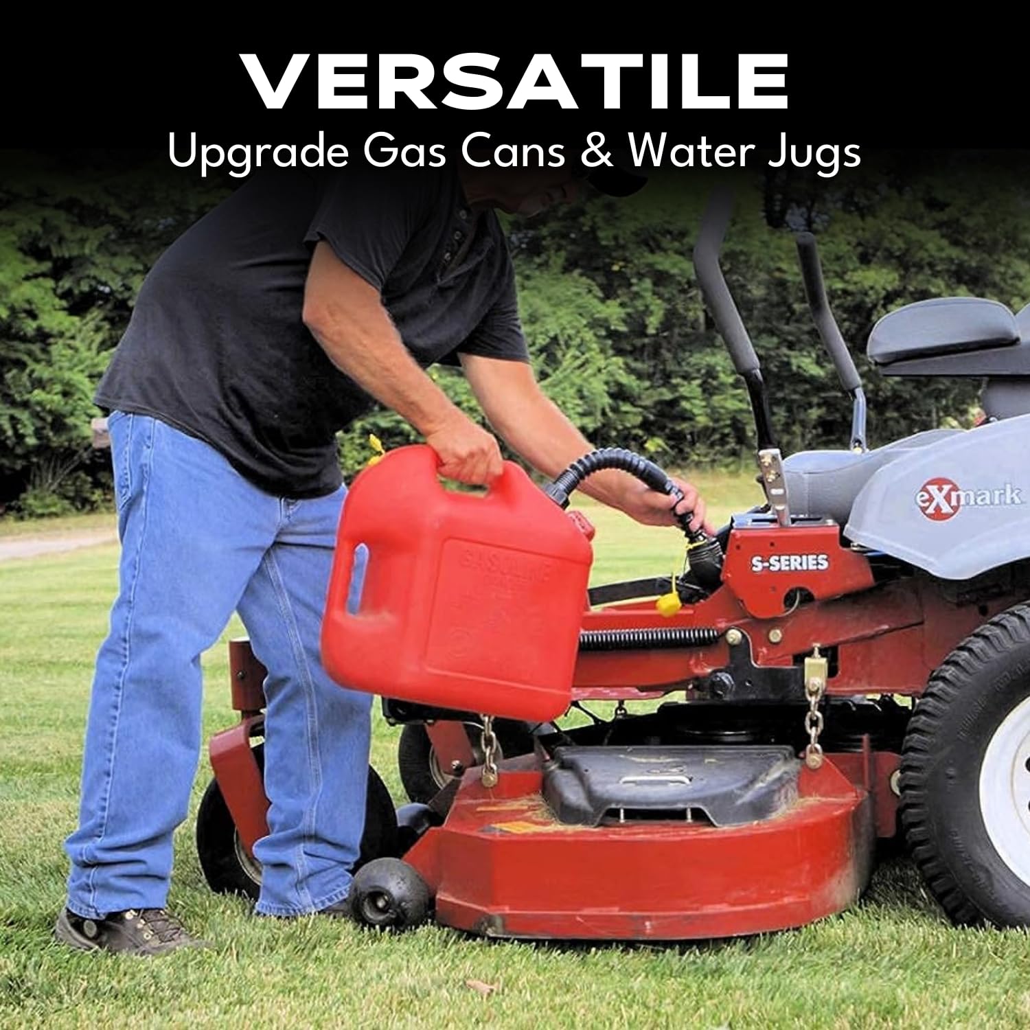SPILL-FREE, SECURE DESIGN FOR CLEAN POURING – Eliminate fuel spills and leaks with our tight-sealing spout cap and included vent. This design allows smooth, consistent flow while keeping air pressure balanced and preventing splashing. Whether you’re topping off a lawn mower, filling a generator, or transferring water, the EZ-POUR spout ensures clean, controlled pouring every time.