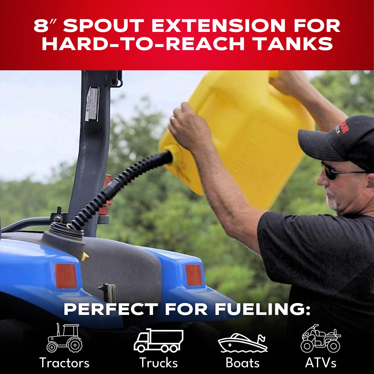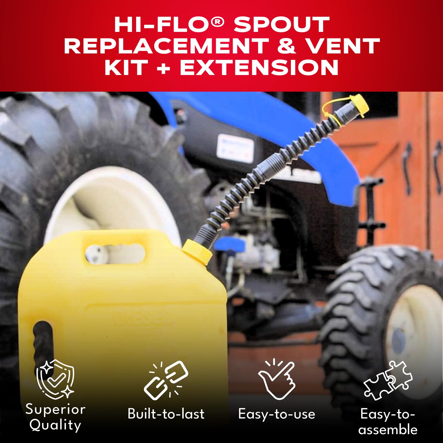 LONG & FLEXIBLE UNIVERSAL GAS CAN & WATER JUG SPOUT REPLACEMENT – Built to last, the EZ-POUR HI-FLO Spout is made from extra-dense, heavy-duty material that won’t crack or become brittle in cold weather. This flexible spout provides a fast, smooth fuel flow with an additional extension, if needed, allowing for the spout length of 16”—helping you pour with control while reducing waste and spills. Perfect for refueling lawnmowers, tractors, generators, motorcycles, boats, and more.