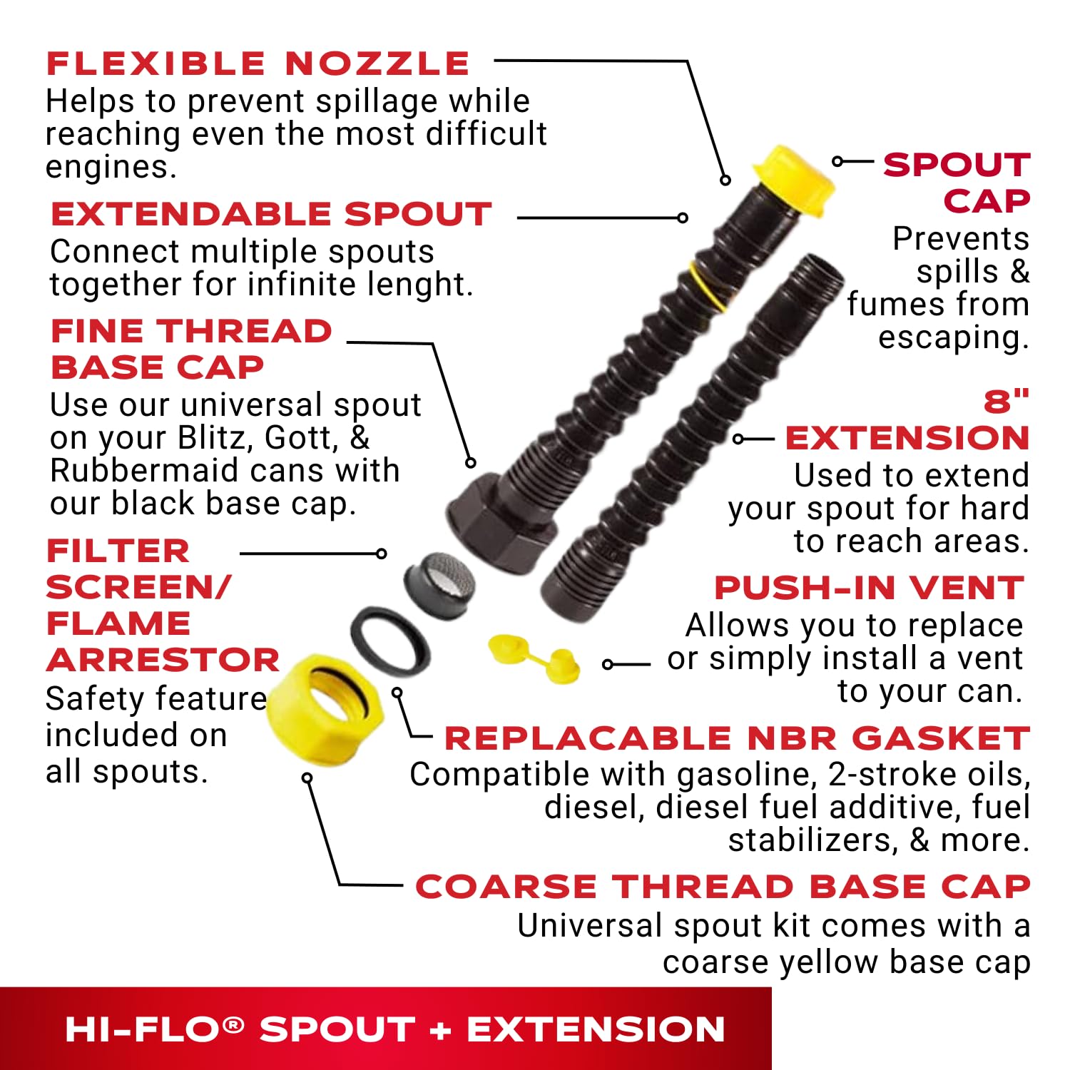 DURABLE GAS CAN & WATER JUG SPOUT KIT – This complete kit makes your old gas cans & water jugs perform like new. Including one 8” HI-FLO spout, one 8” extension, spout cap, tether, flame arrestor, yellow and black base caps, and a 1/2” replacement push-in vent. The HI-FLO spout can be 8” or be extended to 16”, still allowing for FAST flow. The HI-FLO spout can empty a 5 gallon can in just 35 seconds! Every piece is precision-made to ensure a tight, leak-free fit on a wide range of containers.