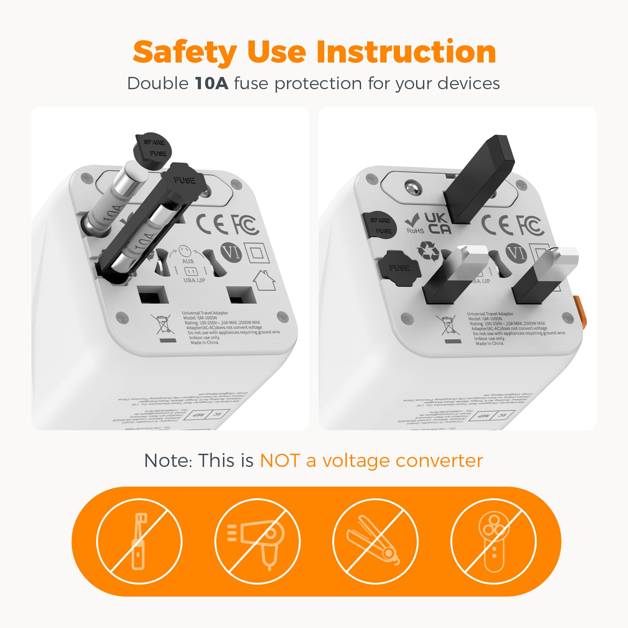 Double 10A Fuse: Power adapters for international travel has dual 10A replaceable fuses, effectively preventing devices damage from overcurrent; Travel power adapter provides you with a reliable charging environment