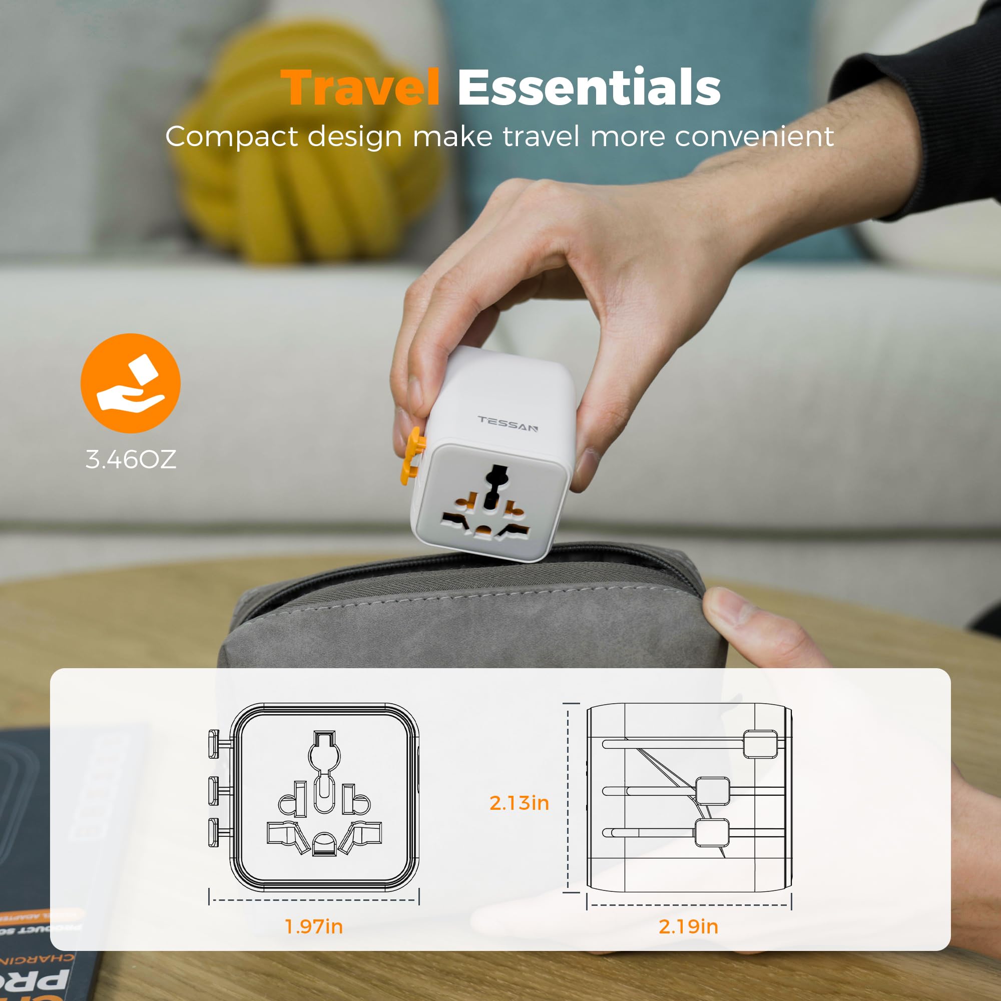 Space Saving: The portable size and weight of this universal plug adapter are 2.19× 2.13× 1.97 in and 3.46 oz, travel plug adapter worldwide saves space in your suitcase and handbag; With no surge protection or cords, TESSAN universal travel adapter is a fully essential item for cruise ships