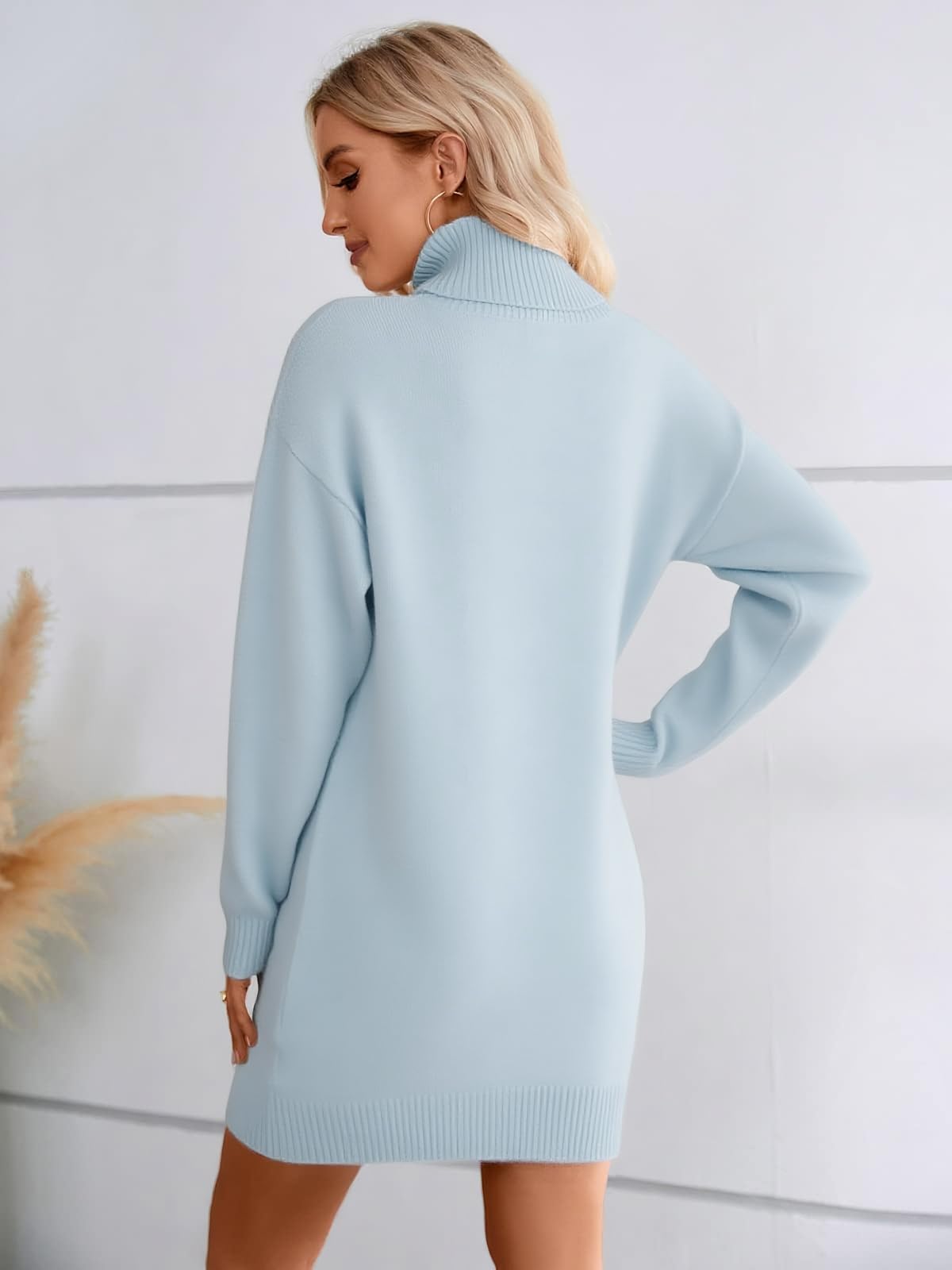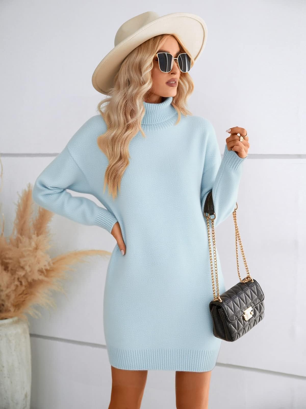 Features: Sweater Dresses, Knitted, Turtleneck, Relaxed fit, Short dress, Above Knee Length, Drop shoulder design, Ribbed at cuffs and hem. Ideal companion for fashionable outfits
