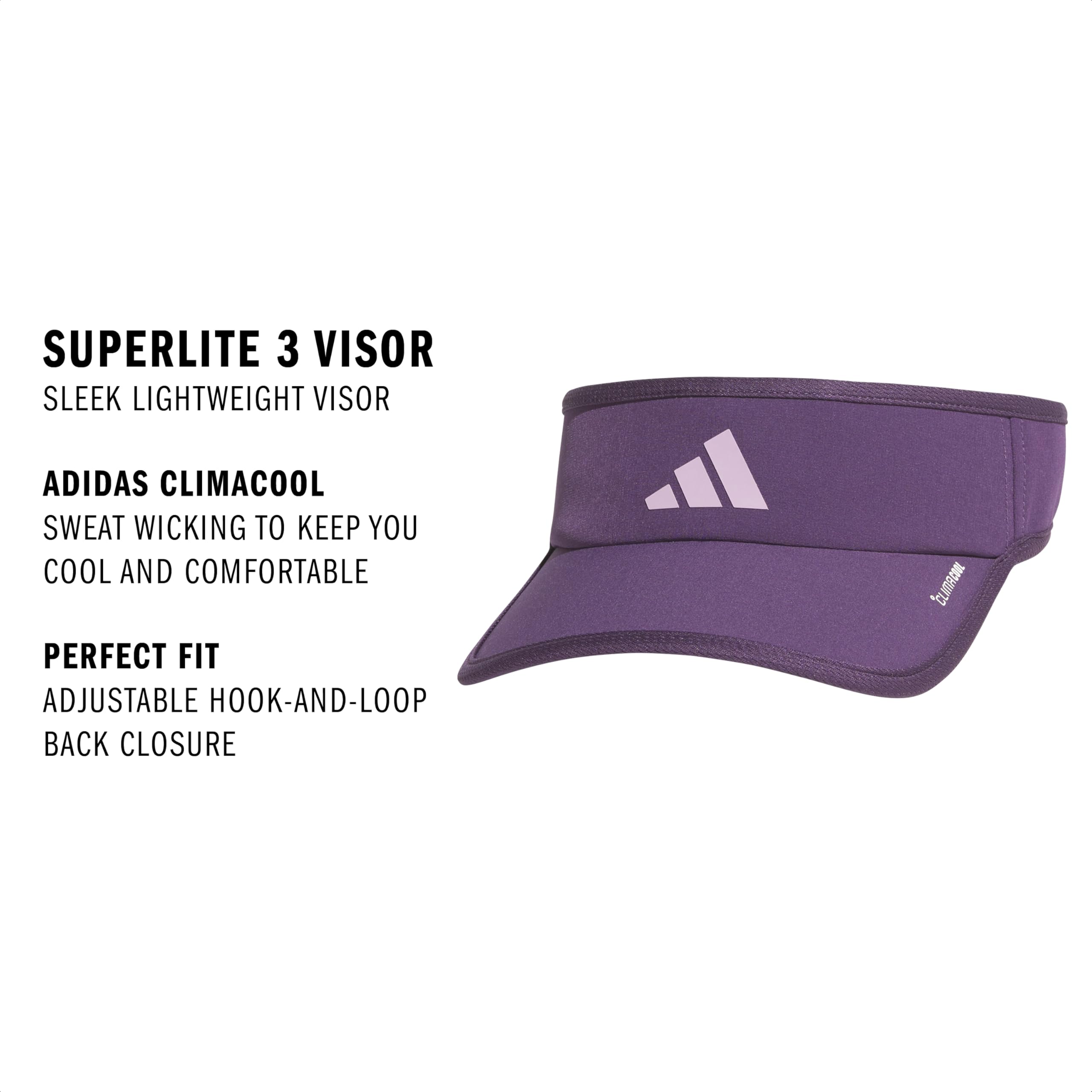Description The adidas Women's Superlite Sport Performance Visor is a great choice for those seeking stylish and functional visor hats for women. Designed with outdoor activities in mind, this sunvisor hat womens provides excellent sun protection. Its sleek and lightweight design is complete with a premium badge of sports logo. The mesh construction of this women's visors allows for airflow and moisture-wicking, making it an ideal choice for active pursuits. The visor not only adds a clean and fashionable touch but also features a non-glare undervisor. Adjust effortlessly with the hook-and-loop back closure, allowing for a personalized fit.
