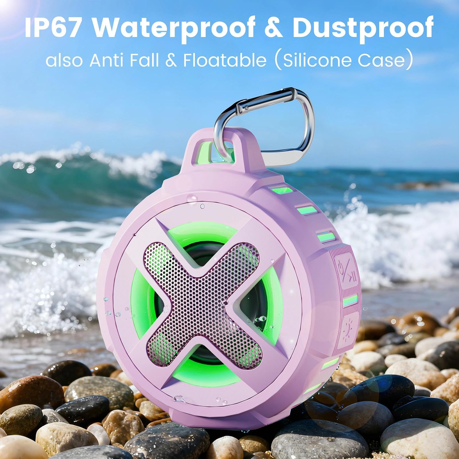 ♬【Certified IPX7 Waterproof】The Waterproof speaker X8 is made of silicone material and glue wrapping process(The silicone cover can be removed for cleaning or replacement a new one), which can ensure waterproof, dust proof and sand proof. its IPX7 protection even withstands complete submersion in up to one meter of water for up to 120 minutes.