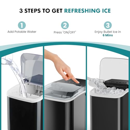 Fast Ice Making:The countertop ice maker can produce 9 fresh ice cubes in just 6 minutes, allowing you to enjoy fresh ice and cold drinks in no time. Equipped with a 1.5-liter water tank, ice cube maker can easily produce 26 pounds of ice per day, making it the ideal choice for enjoying a cool summer.