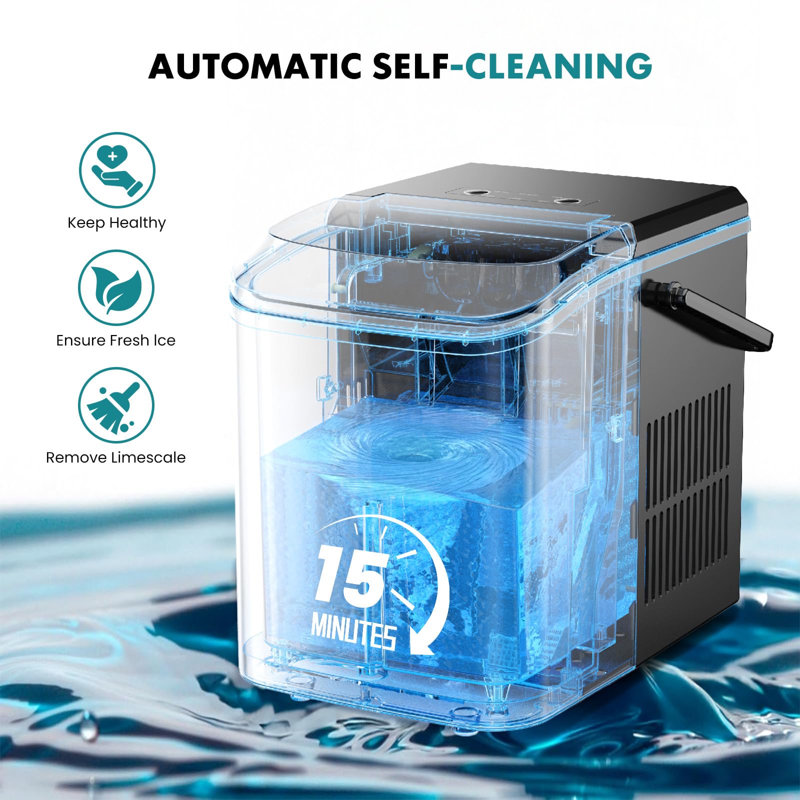 Self-Cleaning Function: The crushed ice maker is equipped with a self-cleaning function. You can start it by pressing and holding the power button for 5 seconds. The top lid can also be easily lifted to allow for a more thorough cleaning.Moreover, the ice machine maker countertop comes with an ice scoop and a detachable ice basket.