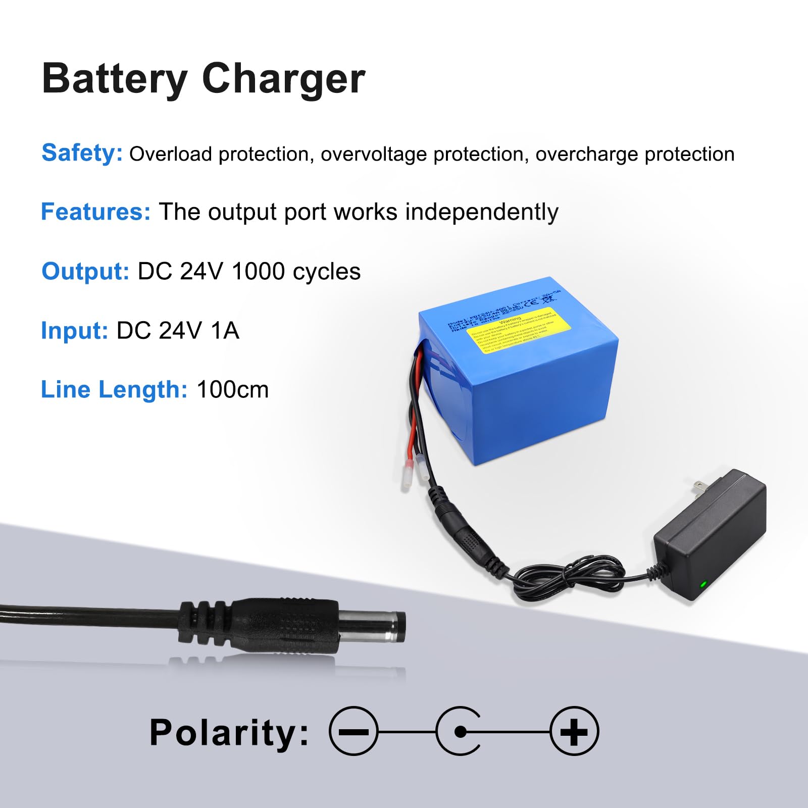 Battery size: 92*62*76mm (L*W*T), Battery weight about 0.68kg, battery cable length 15cm, 24V charger cable length 90cm.