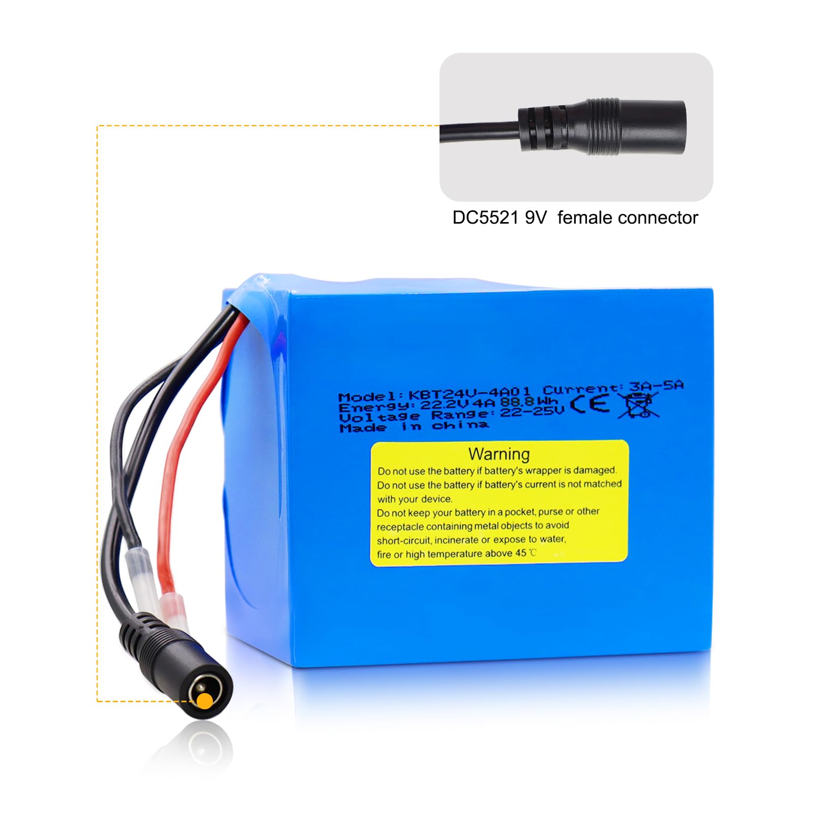 【Box including】: 1* 24V 4Ah Li-ion replacement battery, 1* 24V charger, 1* cable connector, 1*DC5521 male connector cable. Please note battery max discharge 24V 5A / 120W, check if the discharge current will fit your device or not.