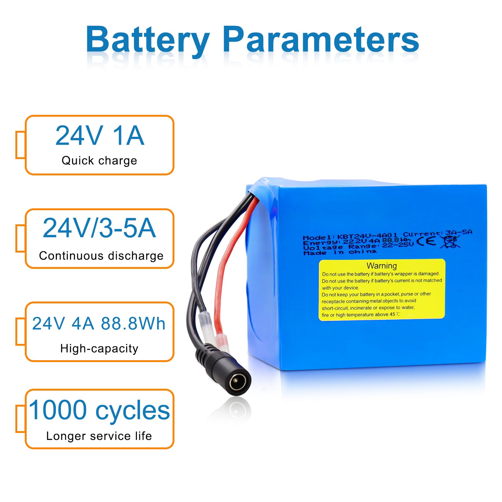 【Premium Battery Performance】: Ternary Lithium-ion battery has high energy density, light weight, long cycle life, good charge-discharge performance, no memory effect, low self-discharge rate, environment-friendly etc. This KBT 24V 4Ah battery has built-in BMS protection PCB Board to prevent battery from overcharge, over-discharge, over-current and short circuit.