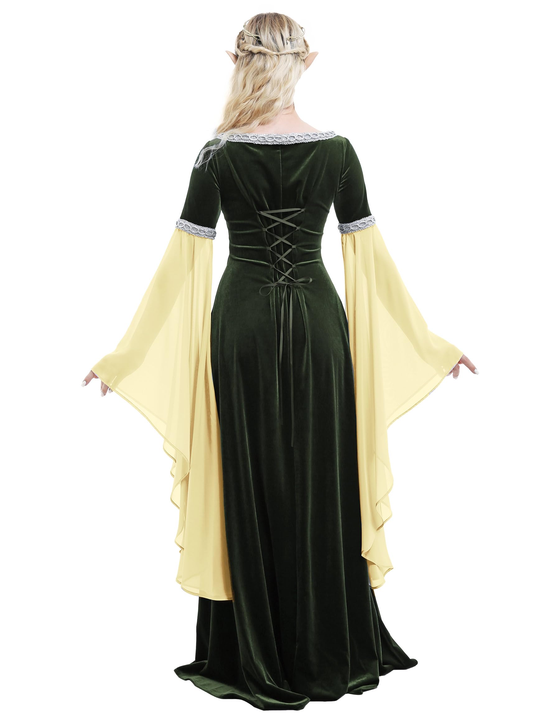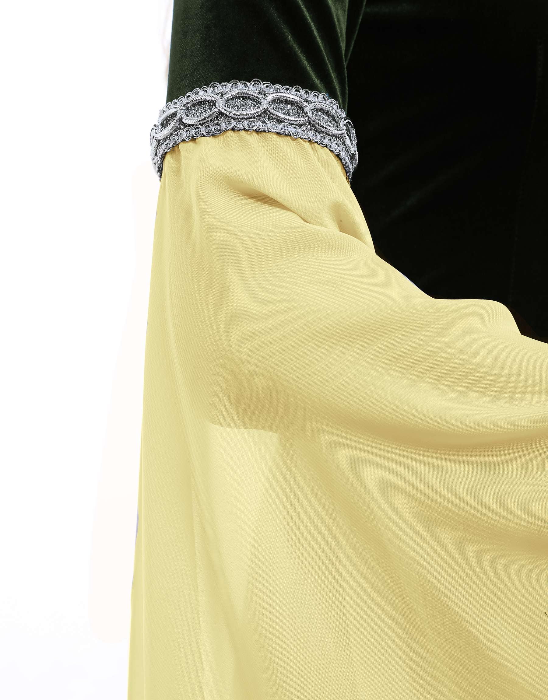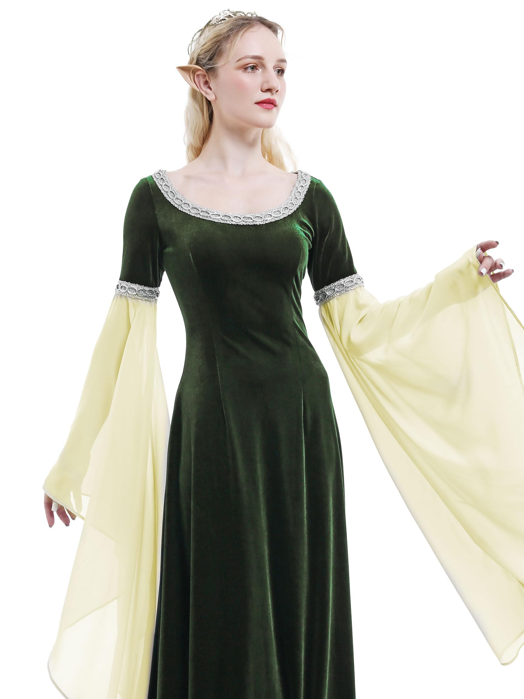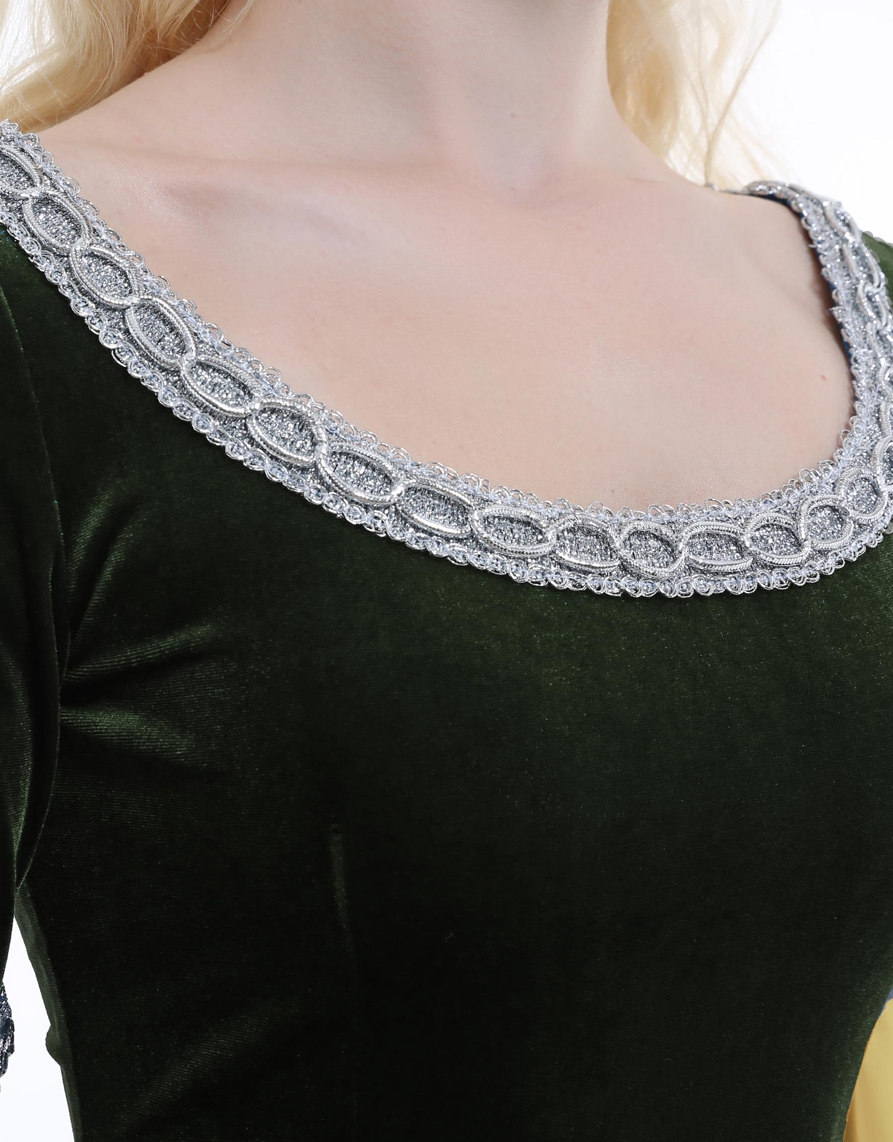 MEDIEVAL DRESS: It belongs to the basic medieval style. The contrast of stretch velvet and chiffon makes the dress design more exquisite. The neckline and cuffs are decorated with wide silver webbing to embellish the clothing. You can wear it with a belt or a cloak.