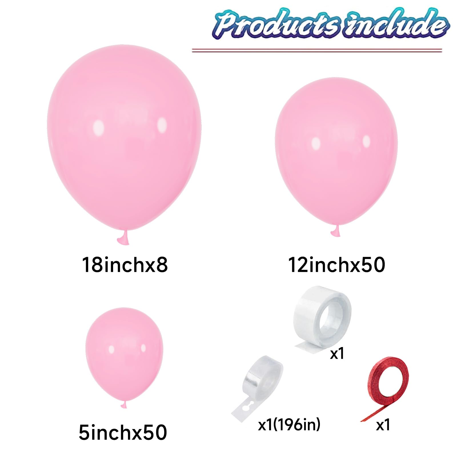 Pink balloon garland kit: 111Pcs Pink balloons pack, including 8 pcs 18 inch balloons, 50 pcs 12 inch balloons, 50 pcs 5 inch balloons, a 5 meter balloon chain, 100 dots of glue dots, a roll of ribbon.