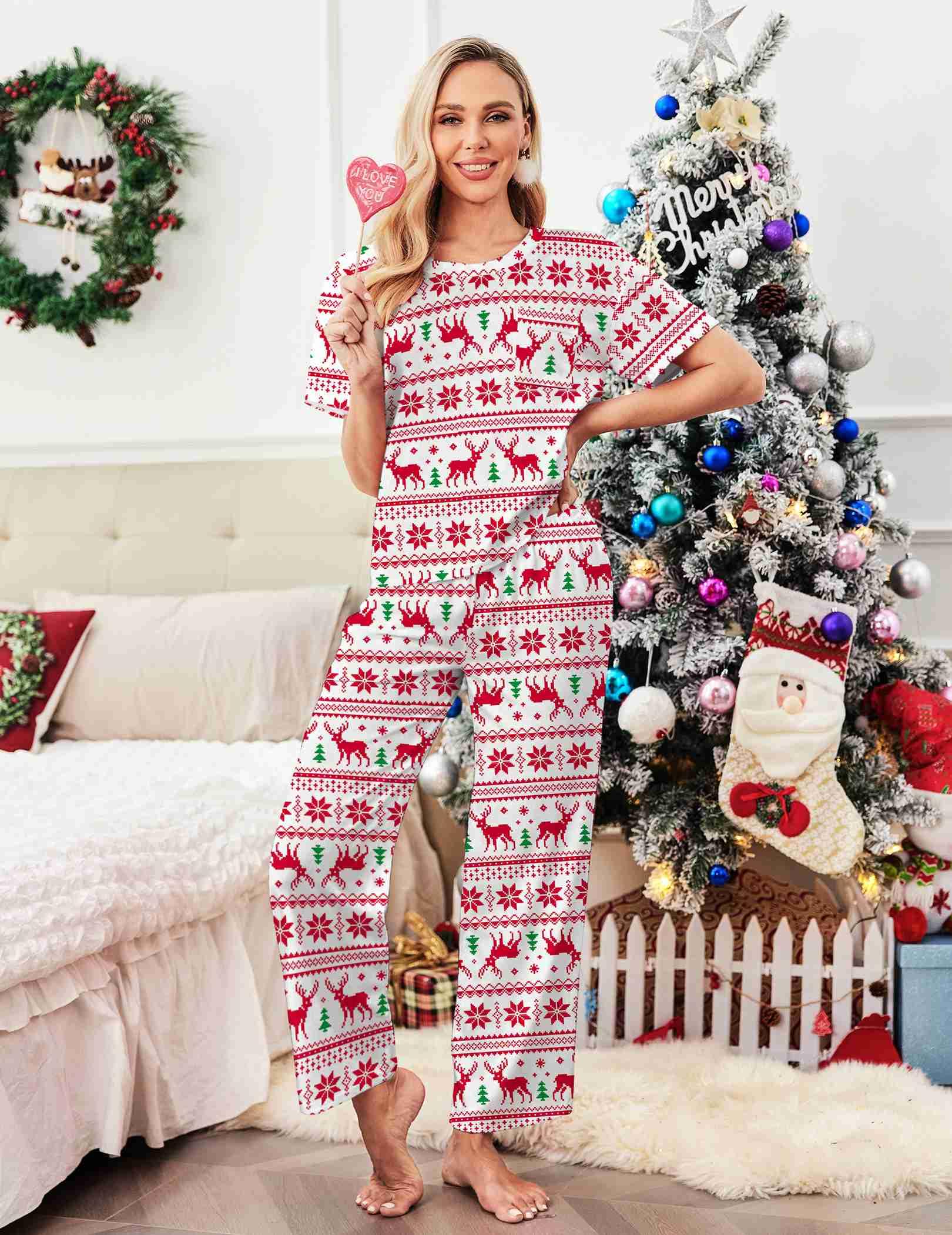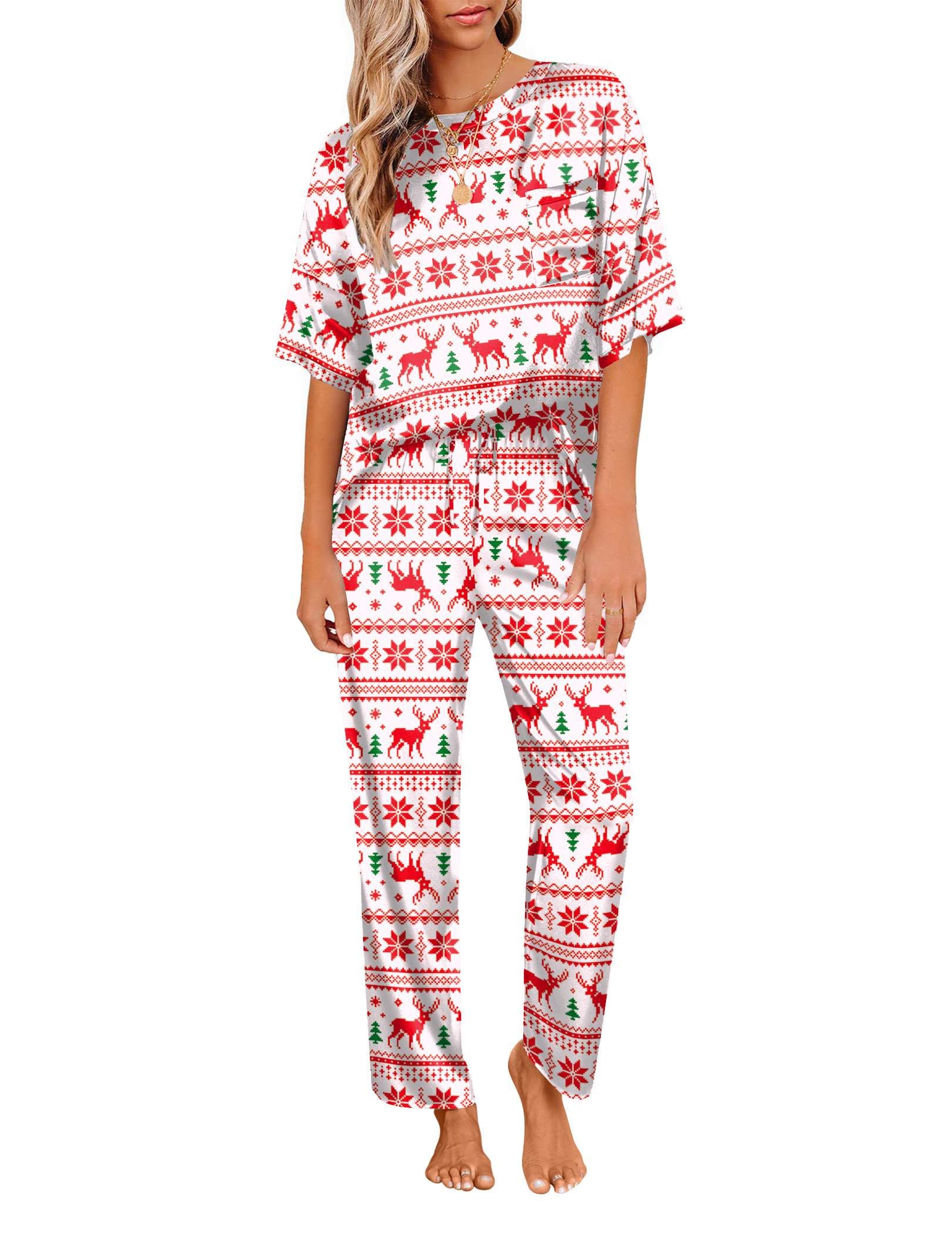 Chiristmas Pajama Set: Ekouaer premium satin pajama set features classic red-white color scheme with elk and snowflake prints, capturing Christmas holiday vibes.