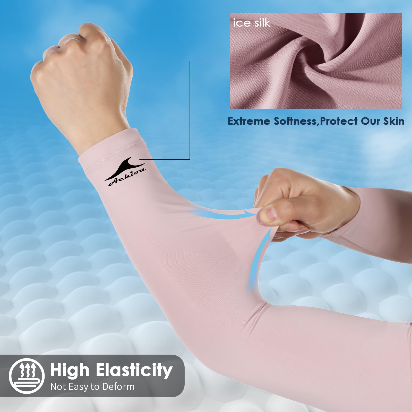 💪Ice Silk & Cooling Sleeve——Achiou arm sleeves for women are made of premium and cooling ice silk. It is smooth, cool and anti-uv because it has better hygroscopicity and breathability than ordinary materials. Performs well in cooling your arms quickly even if you’re doing exercises