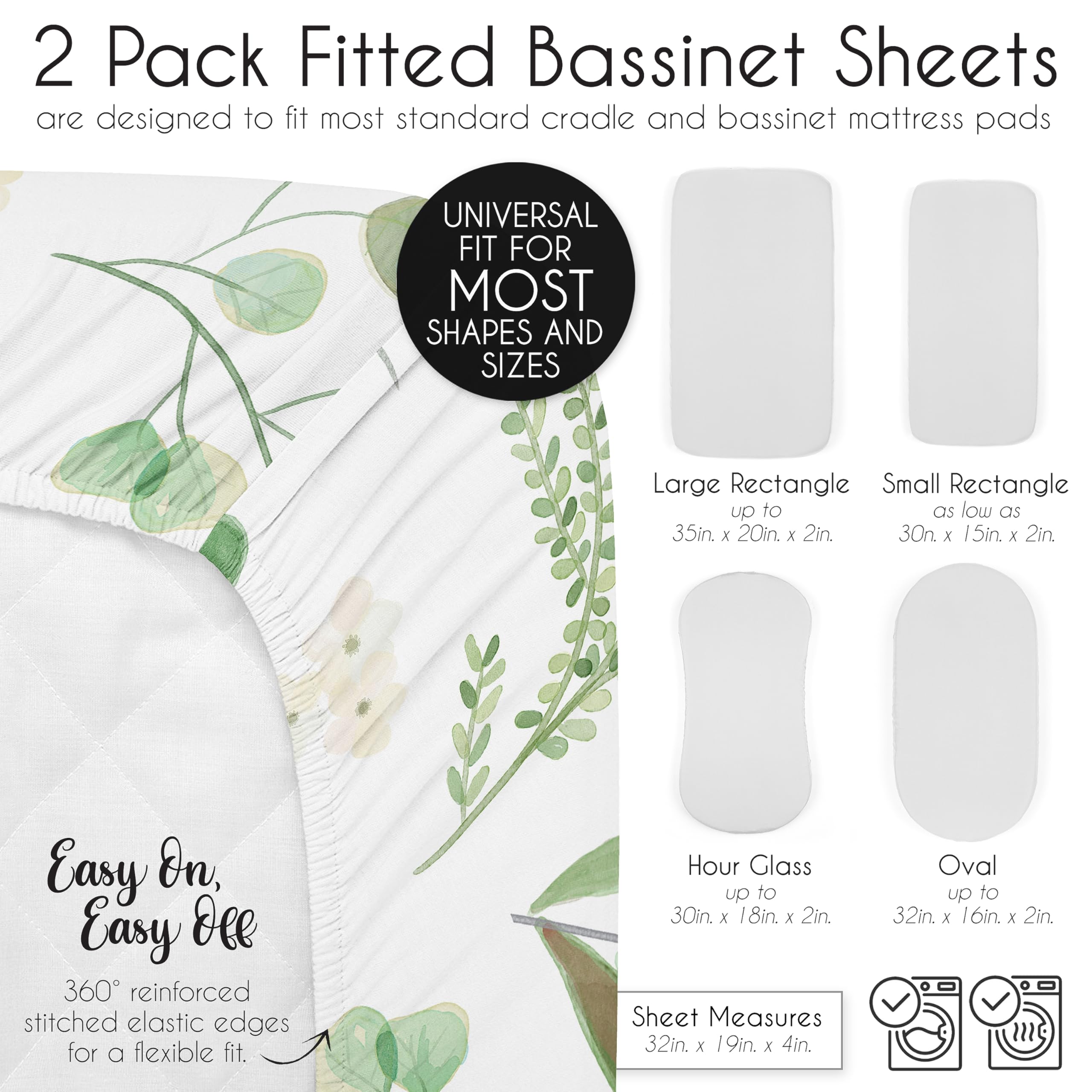 2 Pack Bassinet Sheet Set: 32in. x 19in. x 4in. each. WILL NOT FIT STANDARD SIZE OR MINI CRIBS