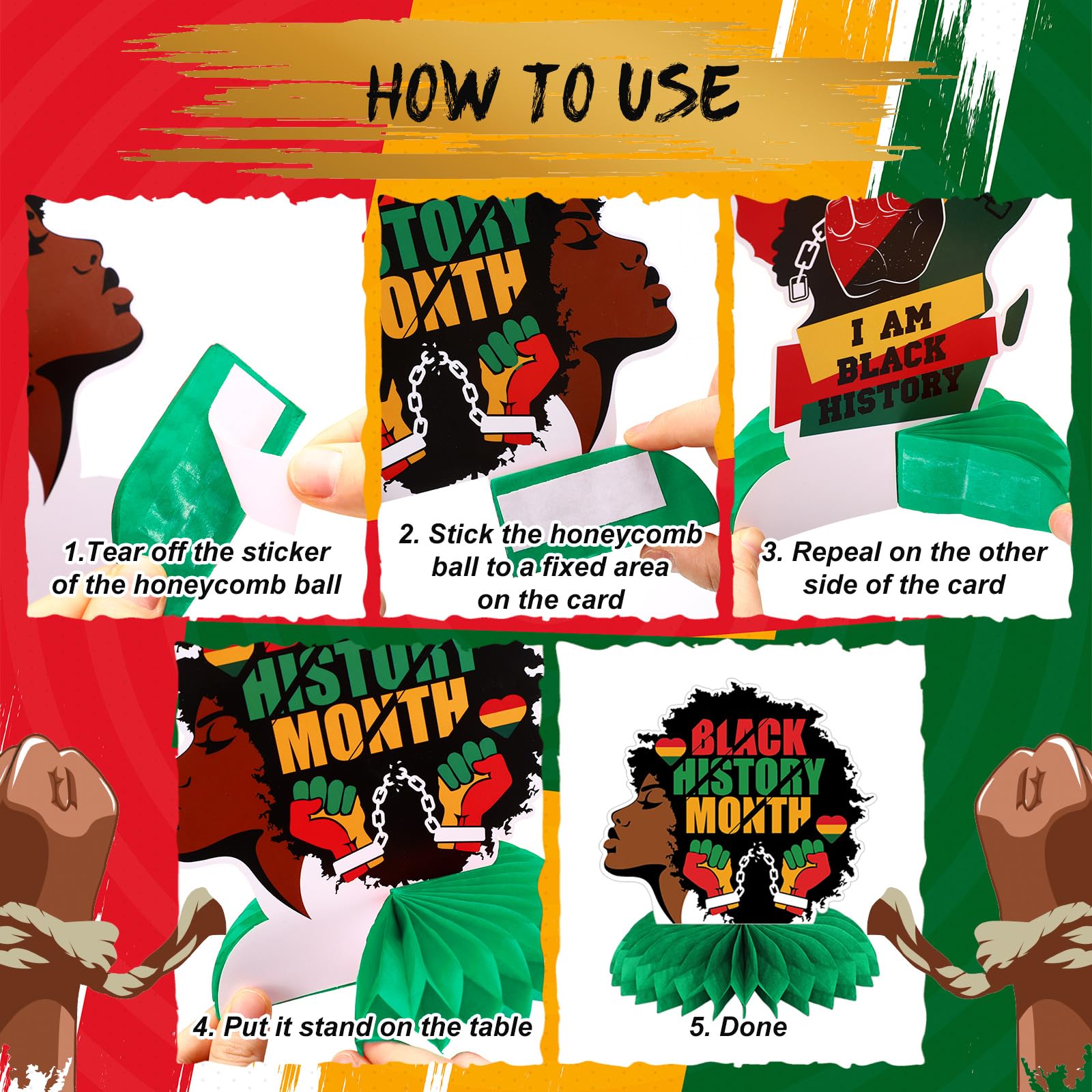 Easy to Assembly: first, you need to tear the sticker down the black history honeycomb table decoration, then put it on the fixed area of the card, put a honeycomb ball on the other side of the card, and finally assemble a honeycomb ornament