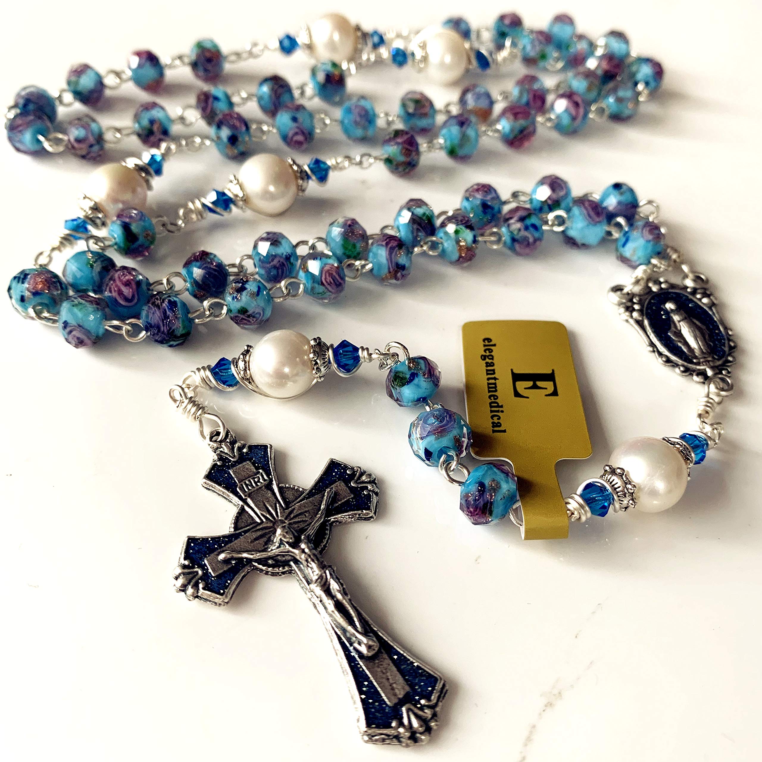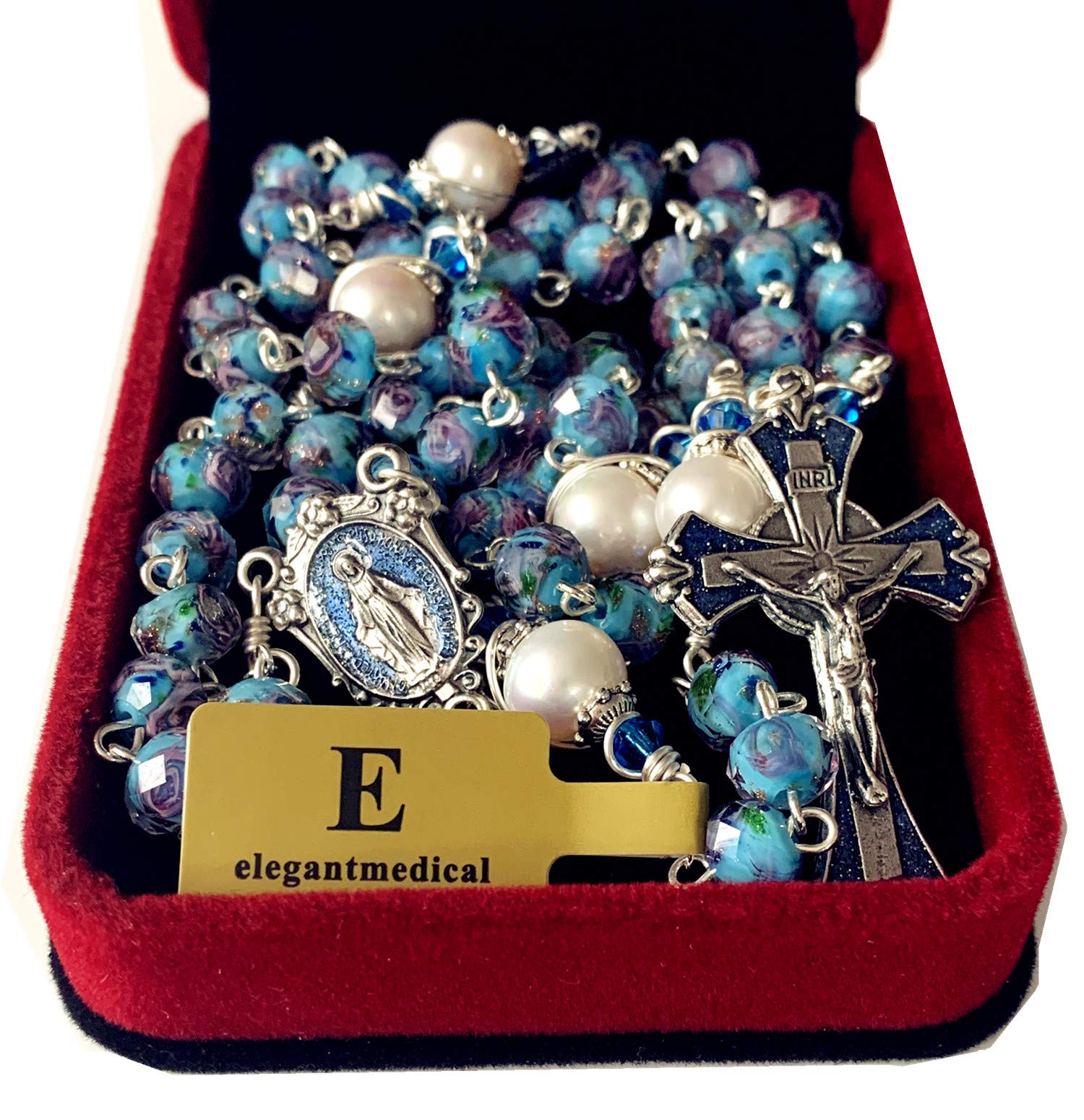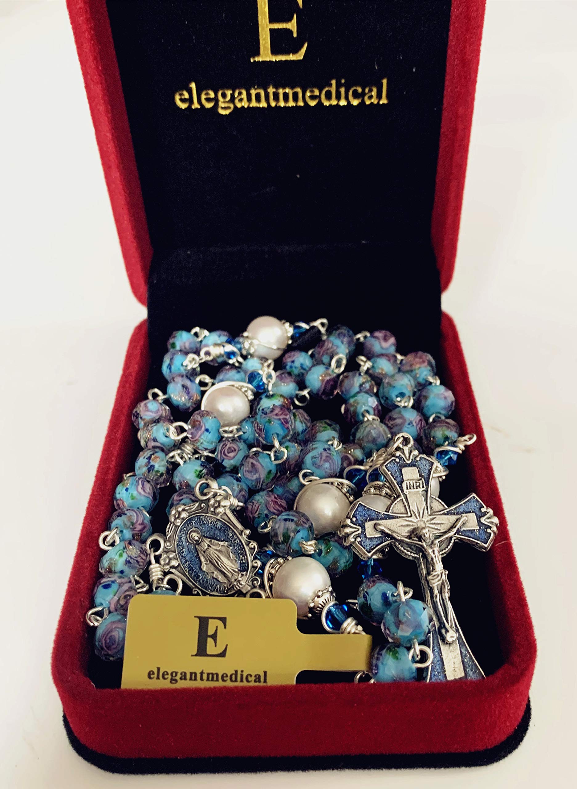 elegantmedical Handmade Veluriyam Rose Beads & Pearl Beads Rosary & Italy Cross Catholic Necklace Gift Box